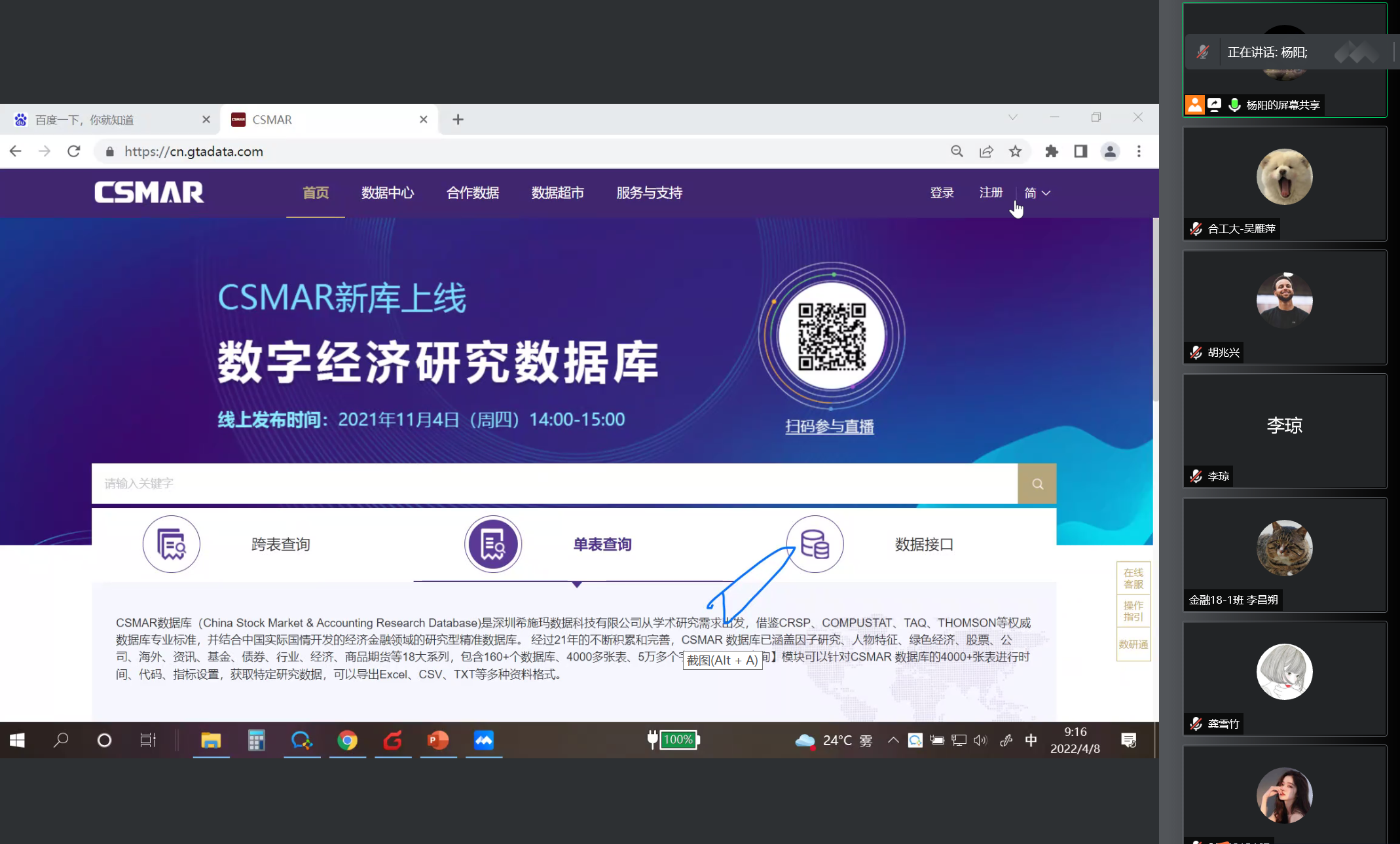 杨阳首先对CSMAR数据库的资源情况,数据的实际应用范围做了基本介绍,并以碳中和、环境研究、金融科技等热点研究为例介绍了CSMAR数据库的特色。而后,分别从数据中心、合作数据、数据超市、服务与支持几个模块向同学们具体演示了数据的搜索和下载等操作。最后,对同学们在数据库实际使用中产生的问题一一进行了解答。