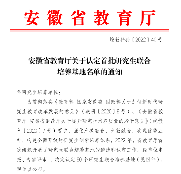 近日,安徽省教育厅首次组织开展了研究生联合培养基地的遴选和认定工作,经单位申报、专家评审后认定首批全省共60个研究生联合培养基地(皖教秘科〔2022〕40号),公司金融工程、应用经济学专业与徽商期货有限责任公司申报的联合培养基地成功入选!