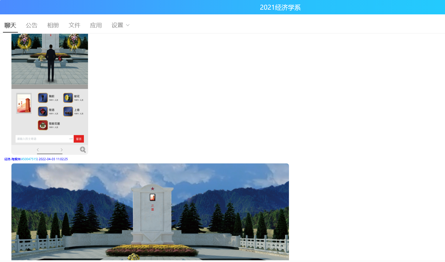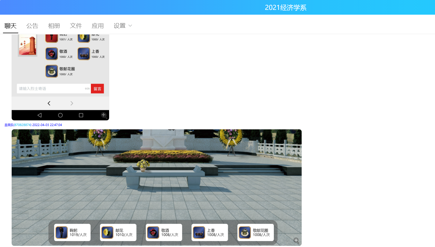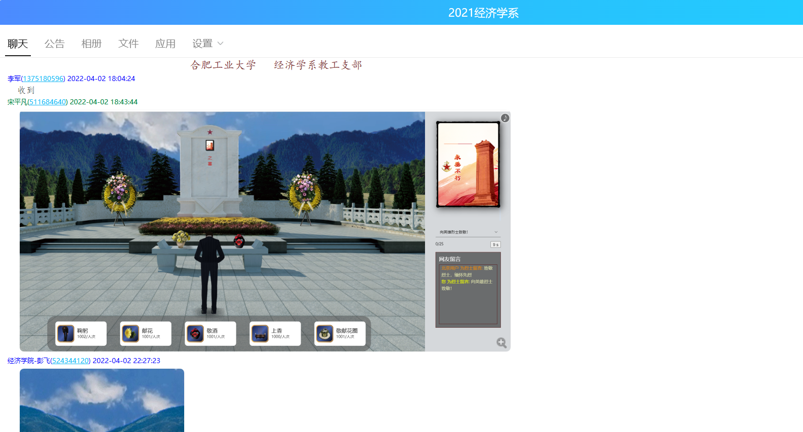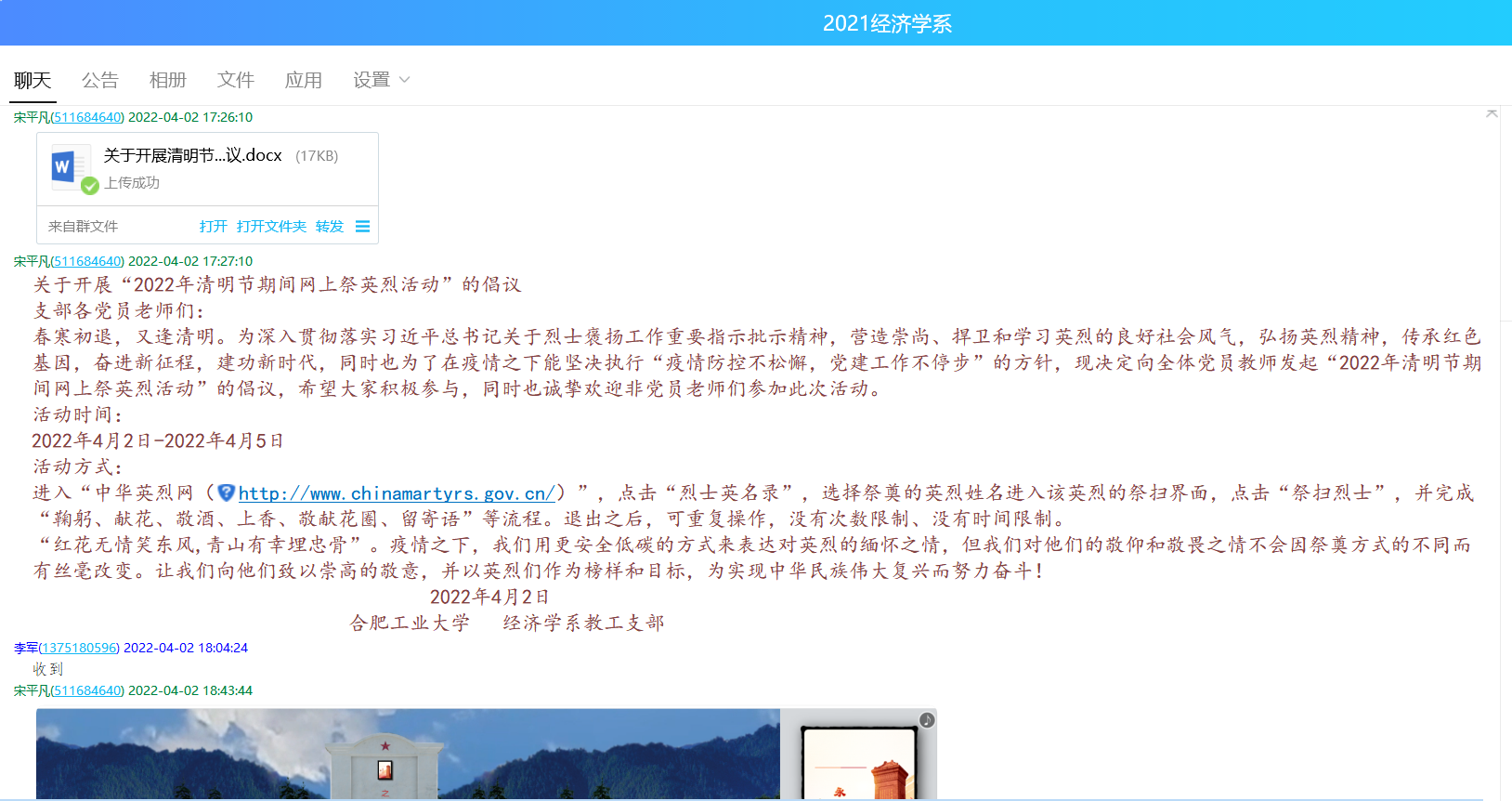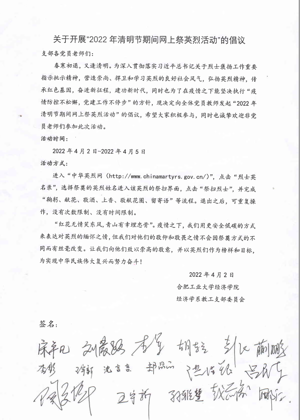 为深入贯彻习近平总书记关于烈士褒扬工作的重要指示批示精神,营造崇尚、捍卫和学习英烈的良好社会风气,经济学系教工支部于清明节期间开展了“2022年清明节期间网上祭英烈活动”。该活动由经济学系教工支部委员会发起倡议,支部党员教师和部分非党员教师积极响应倡议并参加了活动。
