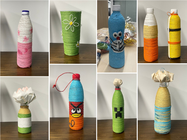 本期活动内容为废旧塑料瓶改造,活动负责人通过现场指导、视频讲解、图片分享等方式向大家具体讲解了装饰废旧塑料瓶的方法,讲解之后,活动参与同学利用麻线、剪刀、胶水等材料不断完善手中的作品,看着手中的废弃塑料瓶慢慢变为一个个漂亮的花瓶,员工纷纷表示很有成就感。