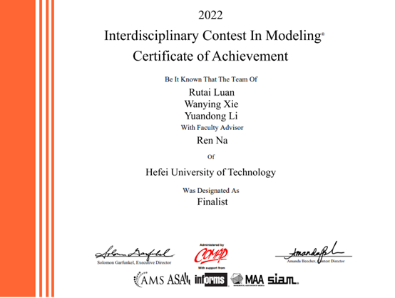 近日,2022年美国老员工数学建模竞赛(MCM/ICM)成绩揭晓,由公司国际经济与贸易(中外合作办学)专业员工栾汝泰、谢婉莹、李源东(排名不分前后)组成的团队荣获特等提名奖(Finalist Winner),指导老师:娜仁,为公司最好成绩之一。