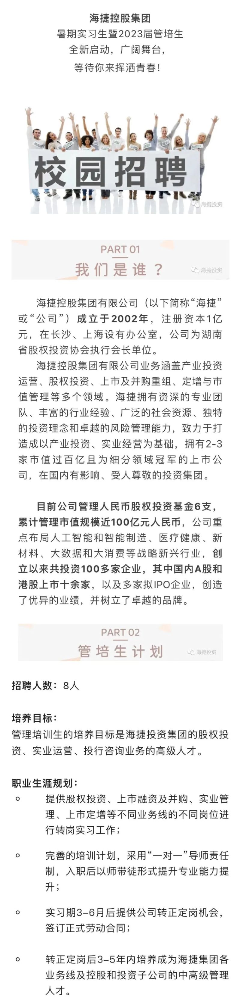 【实习信息】海捷控股集团暑假实习生暨2023届管培生校园招聘正式启动!