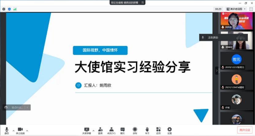 姚雨欣从实习申请、实习过程、实习心得三个方面,分享了个人参加职前培养训练营、制作与提交简历、参加实习申请面试的经历,介绍了个人在大使馆实习中参与的工作内容和经历,分享了自身在具体工作中的收获和思考,阐述了自己在实习中个人能力得到锻炼和提升,感受到多元文化,开拓国际视野,进一步增强了对祖国的热爱,增强了集体意识,提高了职业素养。