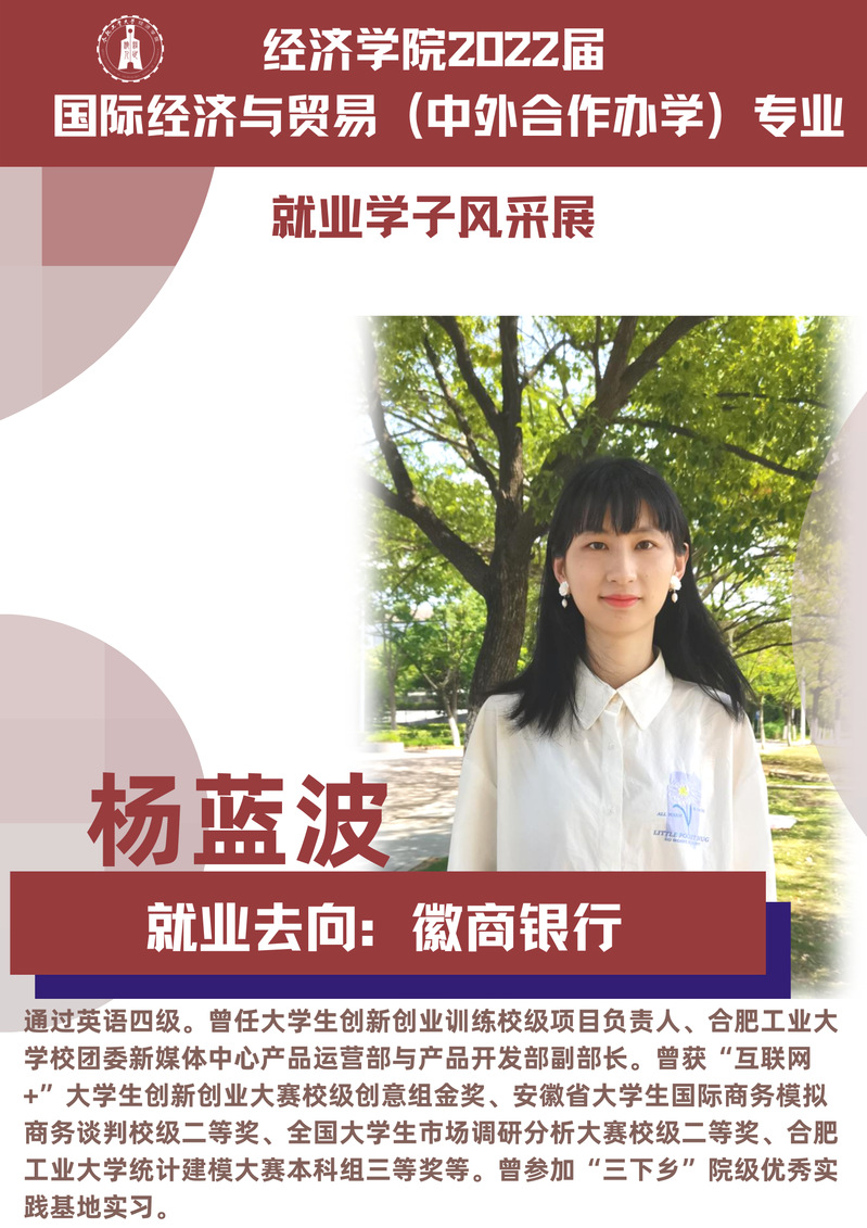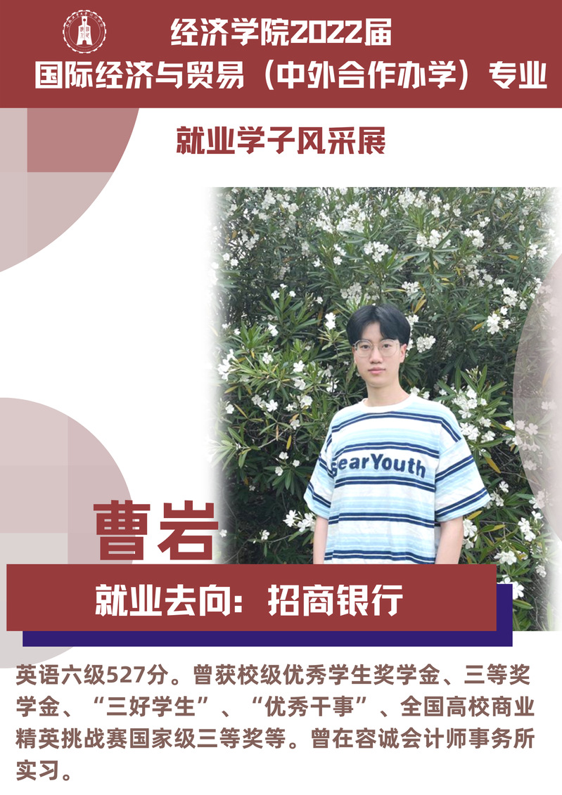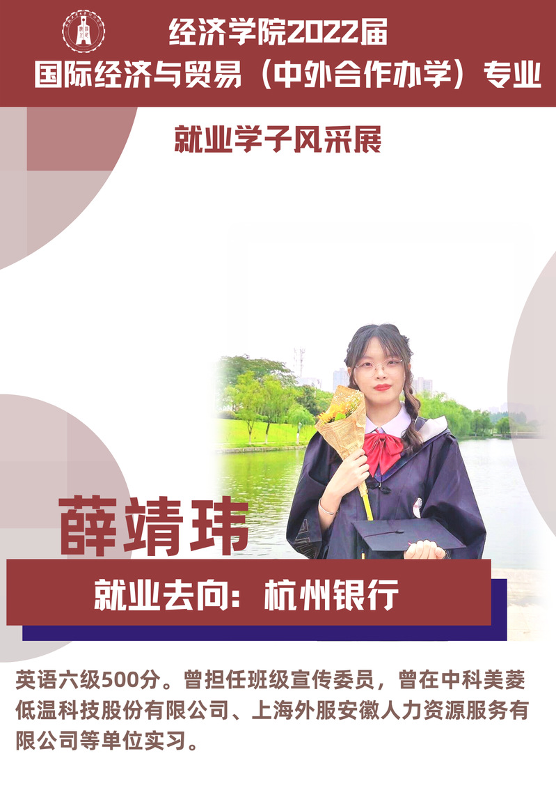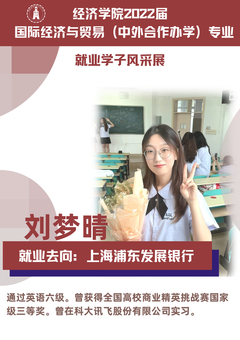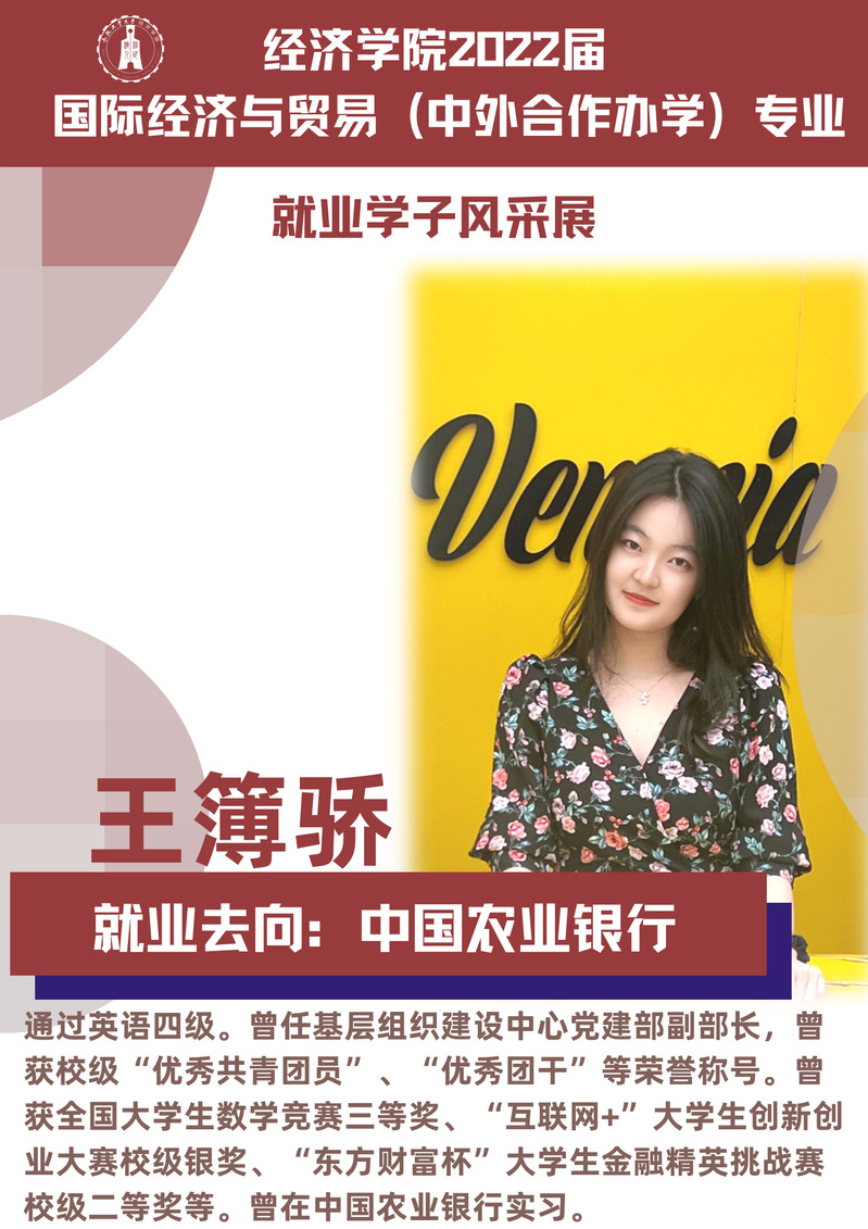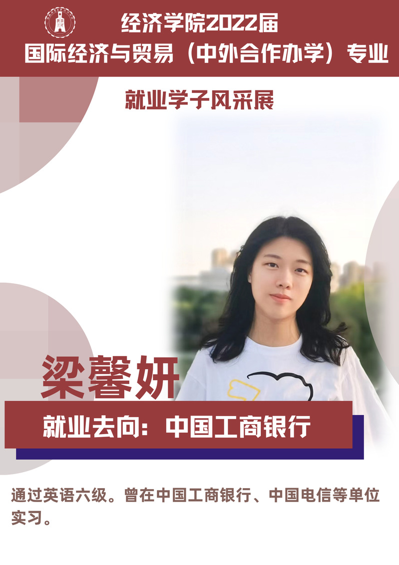 beet365官方网站国际经济与贸易(中外合作办学)专业是国家级一流本科专业建设点。本专业注重将新科技与国际经济与贸易相融合,将贸易传统模式与数字贸易等新业态相结合,培养“强语言、精专业、通规则、能跨界”的高级复合型经贸人才。项目办学以来,人才培养成果呈现出“就业率高、就业单位质量高、升学率高、名校深造比率高、英语水平高”的“五高”显著特征。截至目前,2022届国际经济与贸易(中外合作办学)专业的就业学子中,约72%的员工受到世界500强和中国500强企业的青睐,前往中国工商银行、中国农业银行、中国建筑集团、基恩士(中国)等高质量的就业单位入职。本期推文带领大家共同领略部分就业学子的风采。