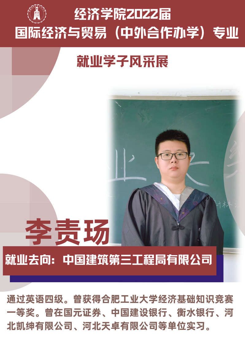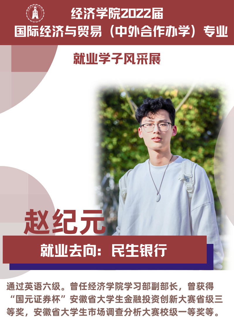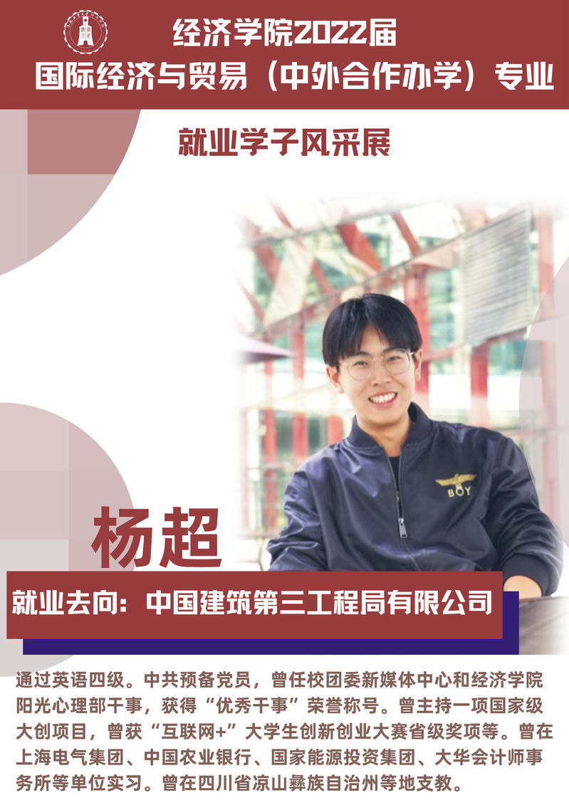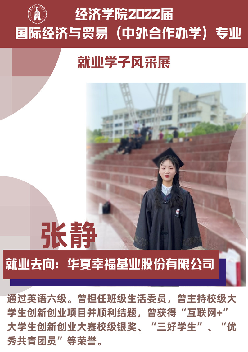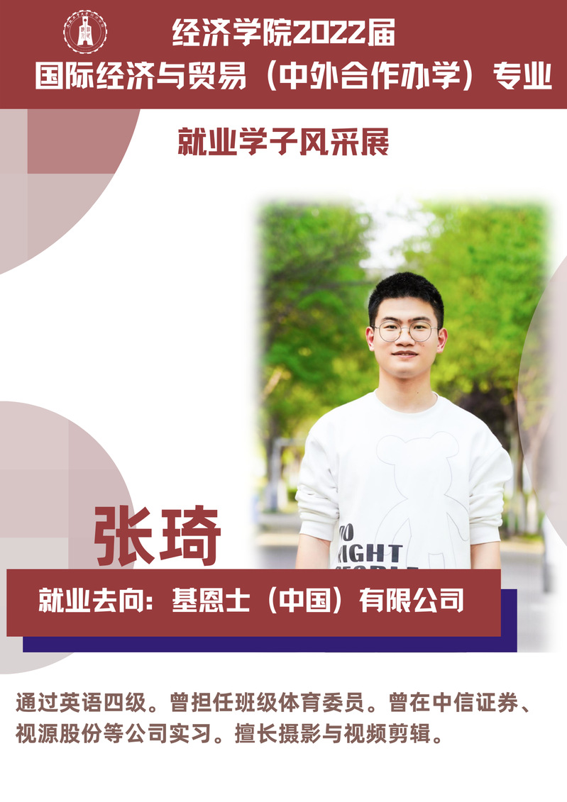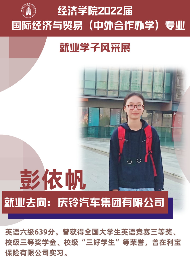 beet365官方网站国际经济与贸易(中外合作办学)专业是国家级一流本科专业建设点。本专业注重将新科技与国际经济与贸易相融合,将贸易传统模式与数字贸易等新业态相结合,培养“强语言、精专业、通规则、能跨界”的高级复合型经贸人才。项目办学以来,人才培养成果呈现出“就业率高、就业单位质量高、升学率高、名校深造比率高、英语水平高”的“五高”显著特征。截至目前,2022届国际经济与贸易(中外合作办学)专业的就业学子中,约72%的员工受到世界500强和中国500强企业的青睐,前往中国工商银行、中国农业银行、中国建筑集团、基恩士(中国)等高质量的就业单位入职。本期推文带领大家共同领略部分就业学子的风采。