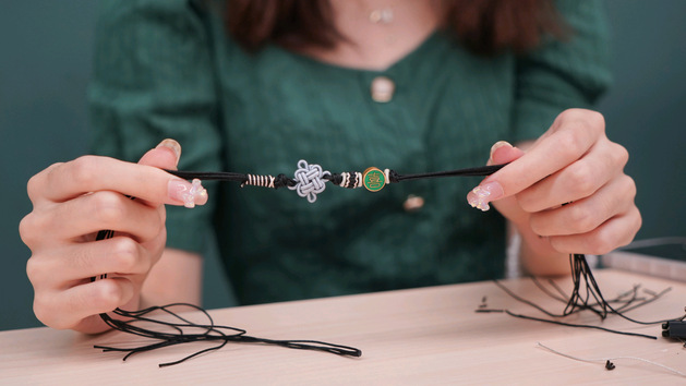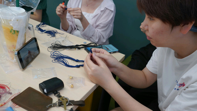 活动负责人向同学们介绍了绳结的历史背景,并以视频播放等形式展示了手绳的制作方法。同学们纷纷拿起五彩丝线,从最简单的基础学起,由浅入深、循序渐进,丝线在指尖穿梭缠绕,制作出一个个小巧玲珑的绳结。