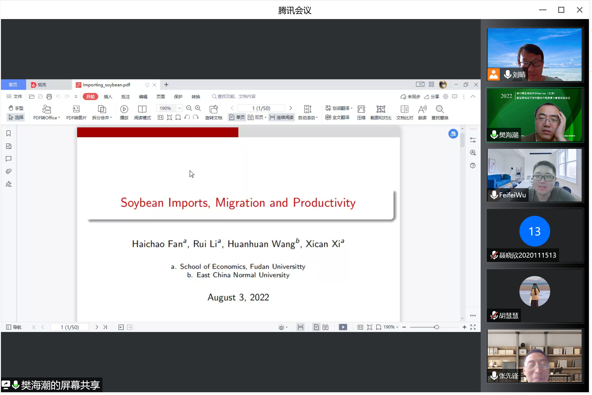2022年8月4日下午,复旦大学beet365樊海潮教授与公司师生进行了学术交流。此次学术交流以线上会议的形式进行,公司80余位师生参加了交流活动。在学术交流活动的第一场,樊海潮教授为公司师生做了一场主题为“Agricultural Imports, Migration and Productivity”的学术报告,报告会由刘晴老师主持。学术报告从理论和实证两方面分析了农产品关税减免对于农业的系统性影响,报告的思路清晰、论点明确,增强了大家对于国际贸易的理解与认识。随后,樊海潮教授与师生开展了学术交流研讨,就论文写作、文献阅读、学术合作等议题与参会师生进行了积极的互动交流,对部分师生的论文构思进行了指点。