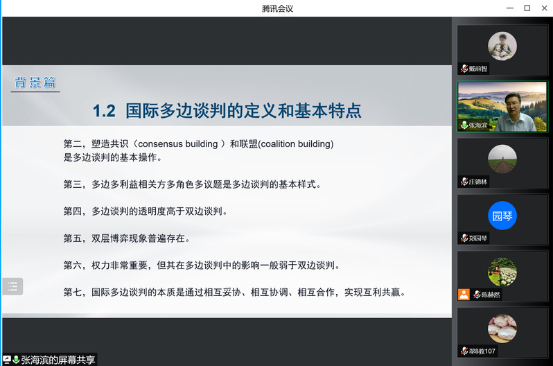 讲座结束后,全球胜任力培养主题研讨会在线上举办。北京大学国际关系公司副经理张海滨,公司经理洪进、副经理庄德林、国际经济与贸易系部分老师及国际教育中心全体人员参加了此次研讨。
