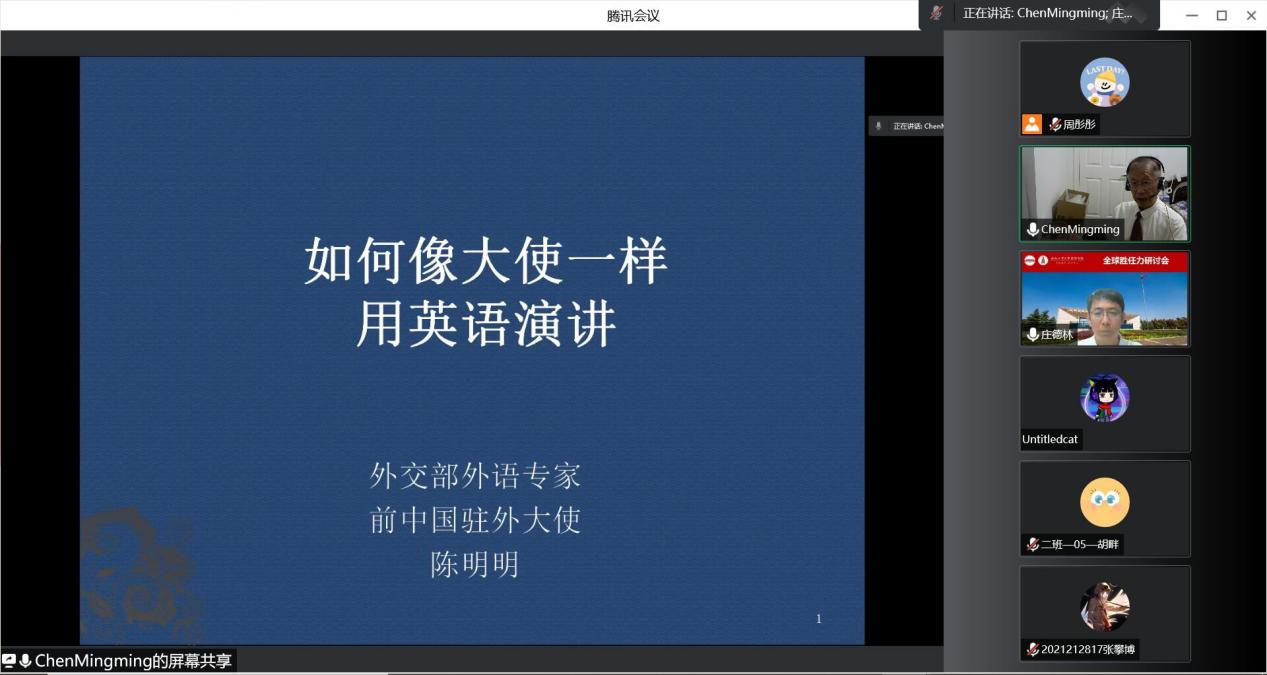 9月12日,公司与公司国际事务处共同主办的全球胜任力云讲堂系列讲座第八讲“如何像中国大使一样用英语演讲”成功举办。外交部外语专家、前中国驻外大使陈明明主讲。陈明明,中国资深翻译家、全国翻译资格考试专家委员会副主任、全国高级翻译职称评审委员会副主任,现任上海交大等多所院校客座教授,中国教育发展战略学会国际胜任力培养专业委员会专家、前中国翻译协会副会长,曾任外交部翻译室主任。公司副经理庄德林、国际教育中心全体人员、国际经济与贸易系部分老师及一百多名在校生参加了此次会议。
