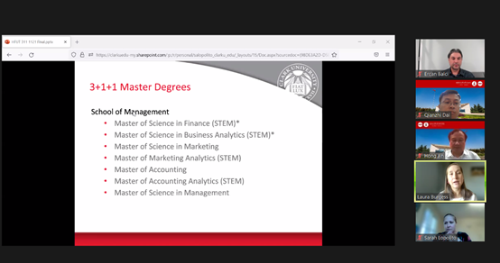 克拉克大学宣讲会和答疑互动以线上形式进行。克拉克大学管理公司助理经理Laura Burgess、职业研究公司副经理Sarah Gallagher、国际教育项目助理经理Sarah Lopolito、美国语言文化机构助理主任Ercan Balci结合“3+1+1”项目情况,分别详细介绍了克拉克大学地理位置、教育理念、硕士项目所在公司概况、团队建设、STEM项目、员工培养、就业指导、员工资源等,让同学们对公司与克拉克大学“3+1+1”联合培养项目有个全面系统了解,助力同学们尽早做好学业规划。在座同学认真聆听,并就克拉克大学教学模式、奖学金等问题与克拉克大学代表用英文进行了踊跃的交流。