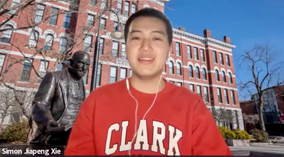 克拉克大学“3+1+1”项目参与员工代表谢家鹏英文发言。他结合个人游览15个国家的经历和个人规划讲述了选择大四期间赴克拉克大学留学的缘由,并表达了成功赴美留学的兴奋与喜悦。此外,他分享了克拉克大学留学体验,包括克拉克大学国际化校园环境和人文环境、课程学习、如何与教授沟通、日常生活等,勉励学弟学妹们要做一个积极的学习者,把握机会,主动适应环境变化,在不断尝试和磨砺中提升自己,努力成为一个具有全球视野的优秀人才。