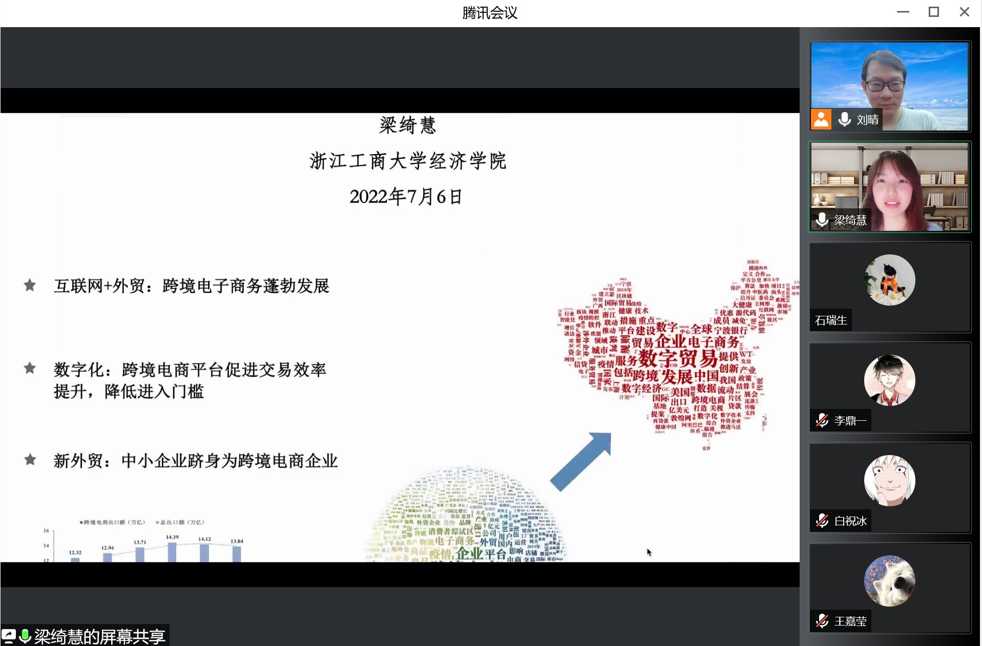 2022年7月6日晚上7点,浙江工商大学梁绮慧博士应邀与公司师生进行了主题为“从跨境电商到数字贸易”学术交流。梁博士从国际贸易模式的演变趋势讲起,详细介绍了全球数字贸易的平台化、全球化、数字化和个性化特征,及其与跨境电子商务、数字经济发展的关系,并进一步介绍了目前数字贸易领域研究的前沿动态。随后的互动环节中,梁博士就文献阅读、论文写作、投稿技巧等议题与参会师生进行了积极的互动交流,对师生提出的问题进行了解答。