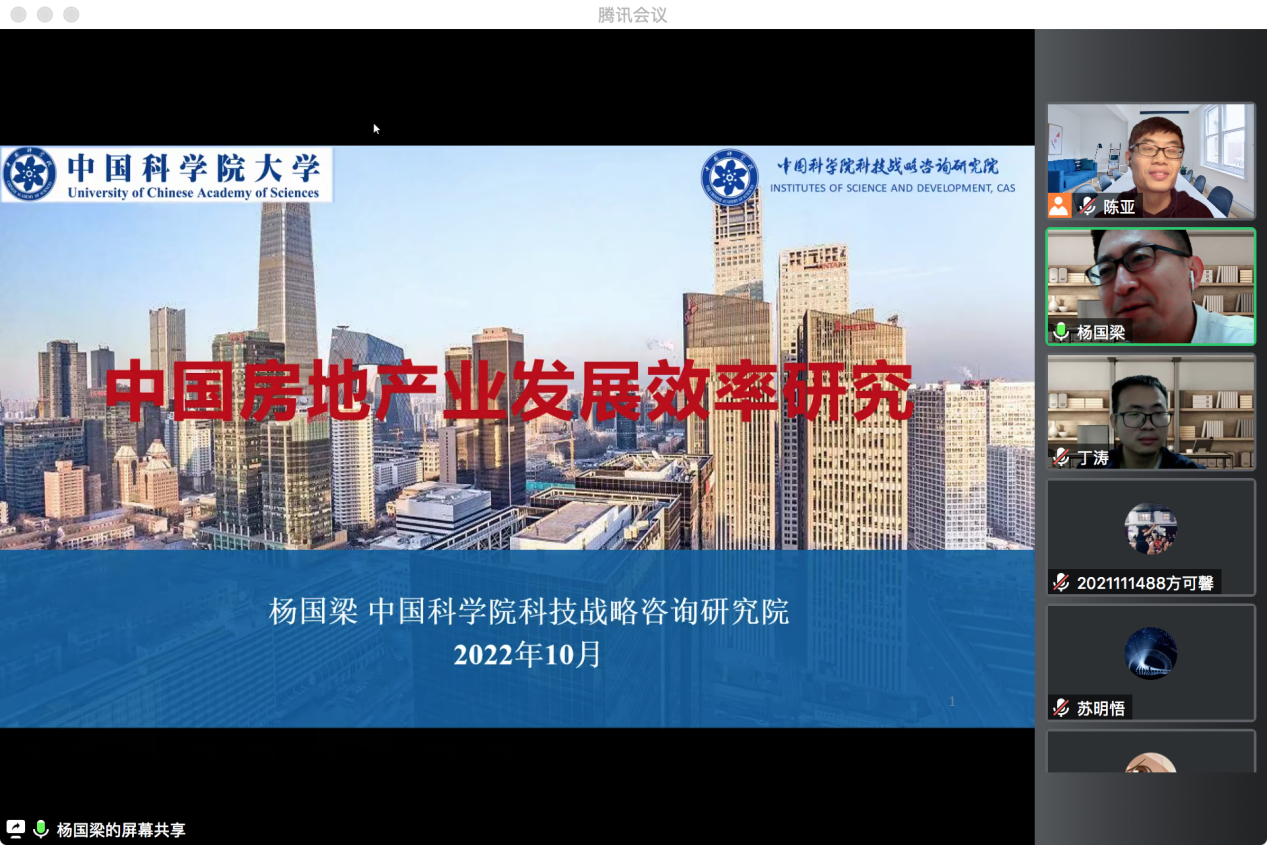 2022年10月27日晚,中国科公司科技战略咨询研究院研究员、中国科公司大学杨国梁教授应邀来公司开展了线上学术交流并作了题为《中国房地产业发展效率研究》的学术报告,陈亚副教授主持报告会,110余位师生参加了此次交流活动。