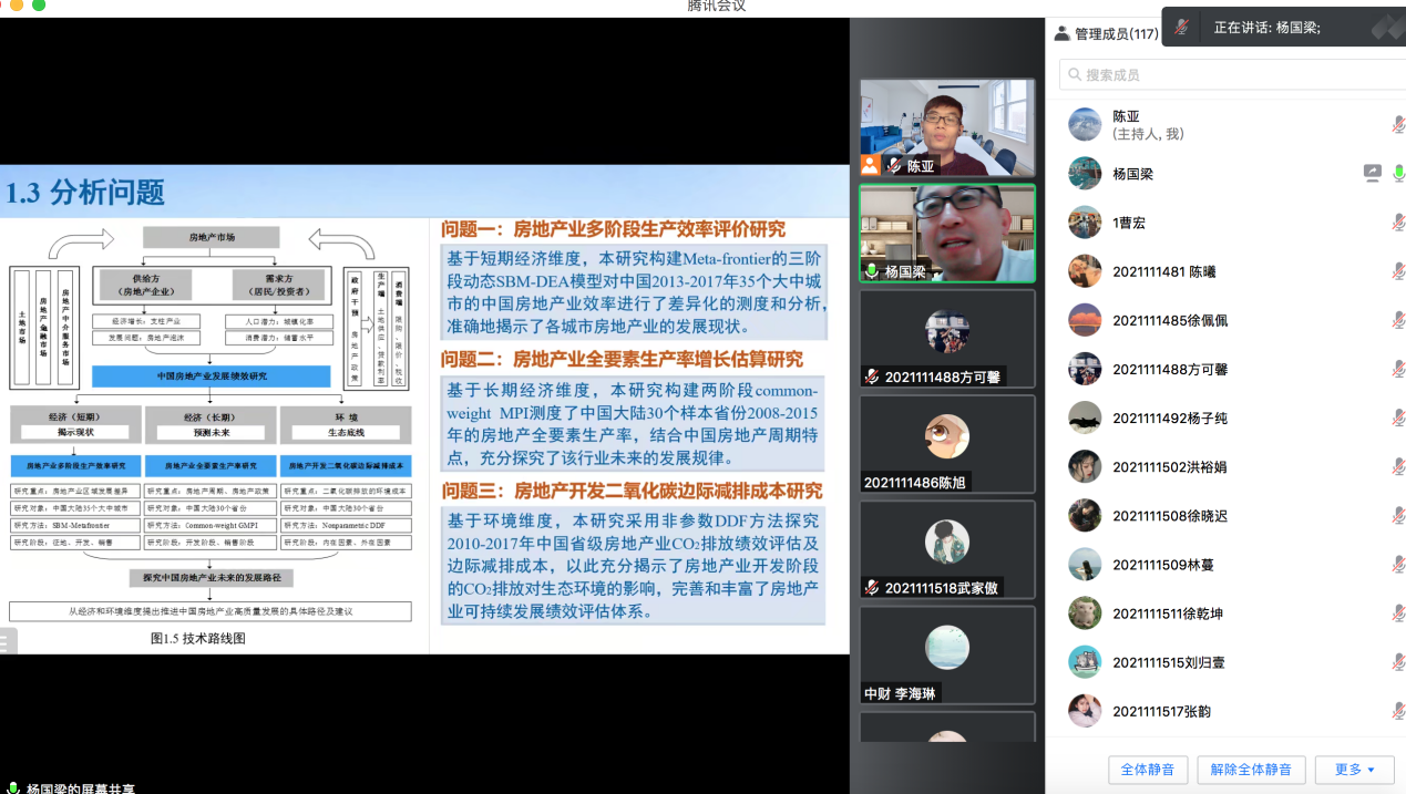 研究发现,对房地产生产过程的模拟有助于识别影响房地产生产效率的关键问题,政府调控政策对中国房地产行业发展影响较大,经济相对不发达地区的全要素生产率对经济的依赖度逐渐下降,而中国各省房地产业的碳减排能力呈上升态势。杨教授从整个房地产业、各地方政府及房地产企业的管理层面分别提出了相应的政策建议。报告最后,杨国梁教授与在线师生进行了广泛而深入的交流,详细回答了在线师生所提出的一系列问题,包括对于当前二三线城市房地产行业现状及背后经济原因的探讨、基于中国地级市样本数据的拓展分析研究等。