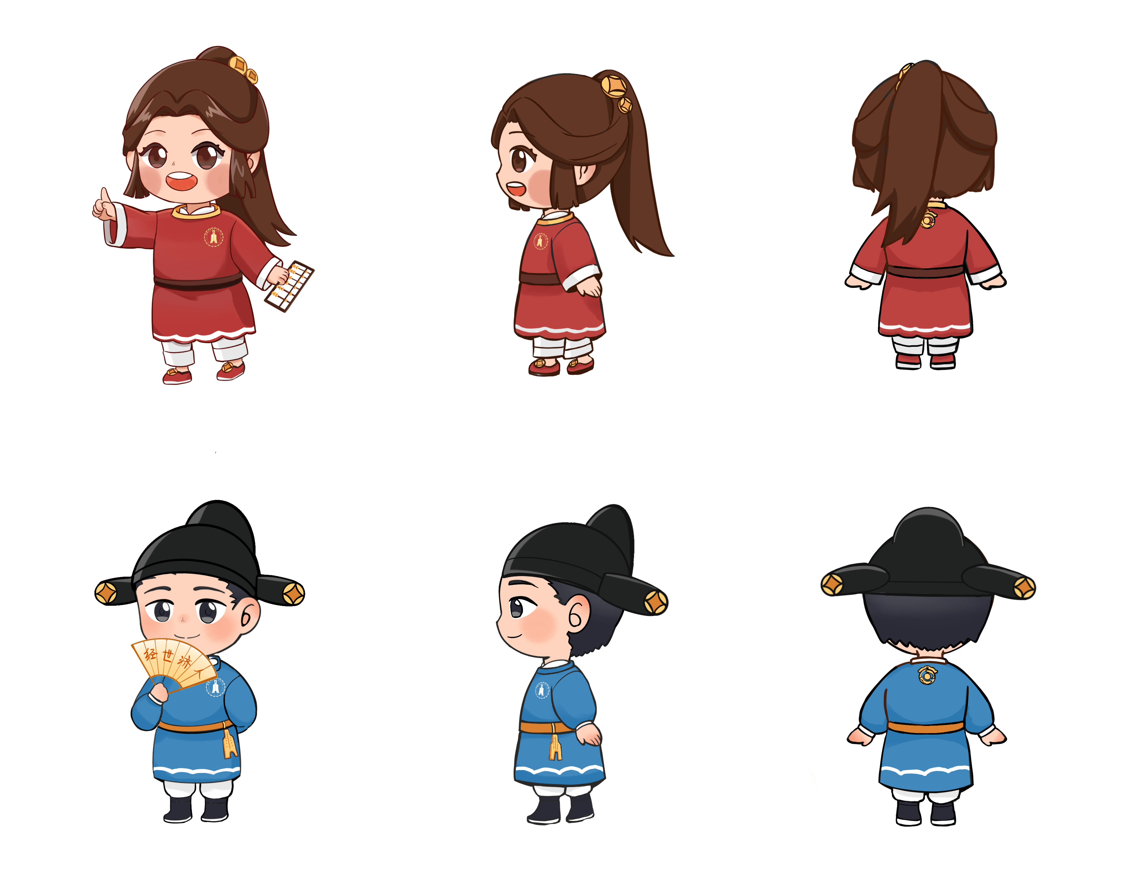 beet365专属吉祥物以国风经院为设计理念,以古代宋朝学子的人物形象为设计基础,女生手持算盘,发饰点缀铜钱;男生手握折扇,腰带悬挂刀币。
