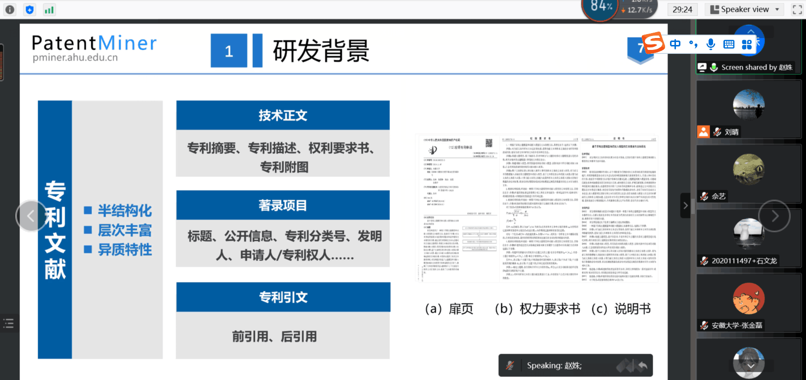 2022年11月17日,安徽大学计算机科学与技术公司赵姝教授应邀与公司师生开展线上学术交流活动。赵姝教授首先通过腾讯会议为公司师生做了主题为“面向专利数据的表示学习方法研究”的学术报告,报告会由刘晴教授主持,公司40余名师生参会。赵姝教授详细介绍了表示学习方法的研究进展,阐述了如何通过将专利数据转化为低维稠密的向量进而实现多个下游任务的过程,从专利文本、发明人、申请人、多层次标签等方面介绍专利研究方法,并展示了团队研发的专利智能服务平台PatentMiner。随后,赵姝教授就文献阅读、机器学习算法、文本分析方法应用等议题与在场师生进行了充分的沟通与交流,耐心解答了师生的相关问题。