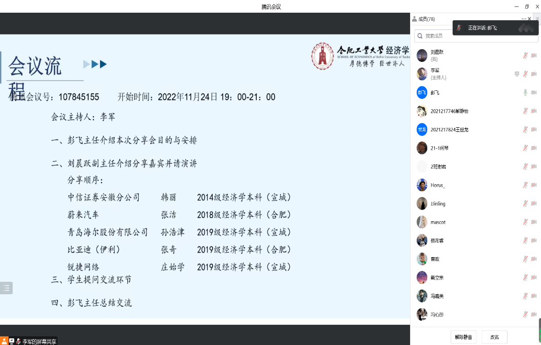 为帮助经济学专业学子做好职业生涯规划、熟悉就业新形势,提升就业技能素养,实现高质量就业,2022年11月24日晚,经济学系2022年度就业经验分享暨职业生涯规划交流会以线上形式成功举办。会议由系就业实习指导团队负责人李军老师主持,系主任彭飞、系副主任刘晨跃、各年级班主任以及经济学专业一百余名员工参加了交流会。此次交流会邀请了经济学专业员工代表韩丽、张洁以及2019级孙浩津、张奇和庄始学三位同学分享了他们的就业体会和求职经验,并一一解答同学们在职业生涯规划和求职过程中遇到的困惑。