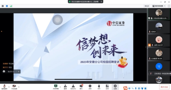 本次线上双选会共有中建六局、中信证券、九江银行、兆尹科技等10家优质企业参会,吸引了100多名本科生和研究生参加。各用人单位通过腾讯会议依次进行企业介绍与招聘宣讲,同学们认真聆听,对宣讲企业的岗位要求、招聘信息、福利待遇等内容作了充分了解,并积极提问,现场气氛热烈。