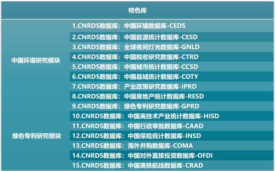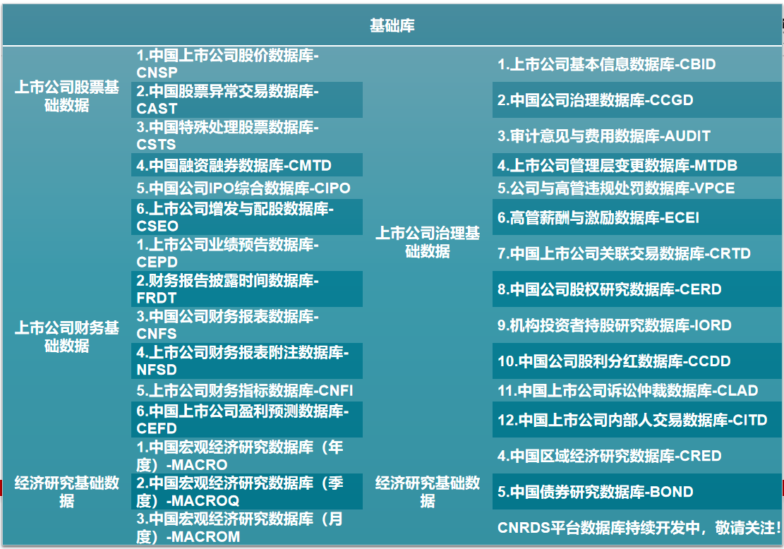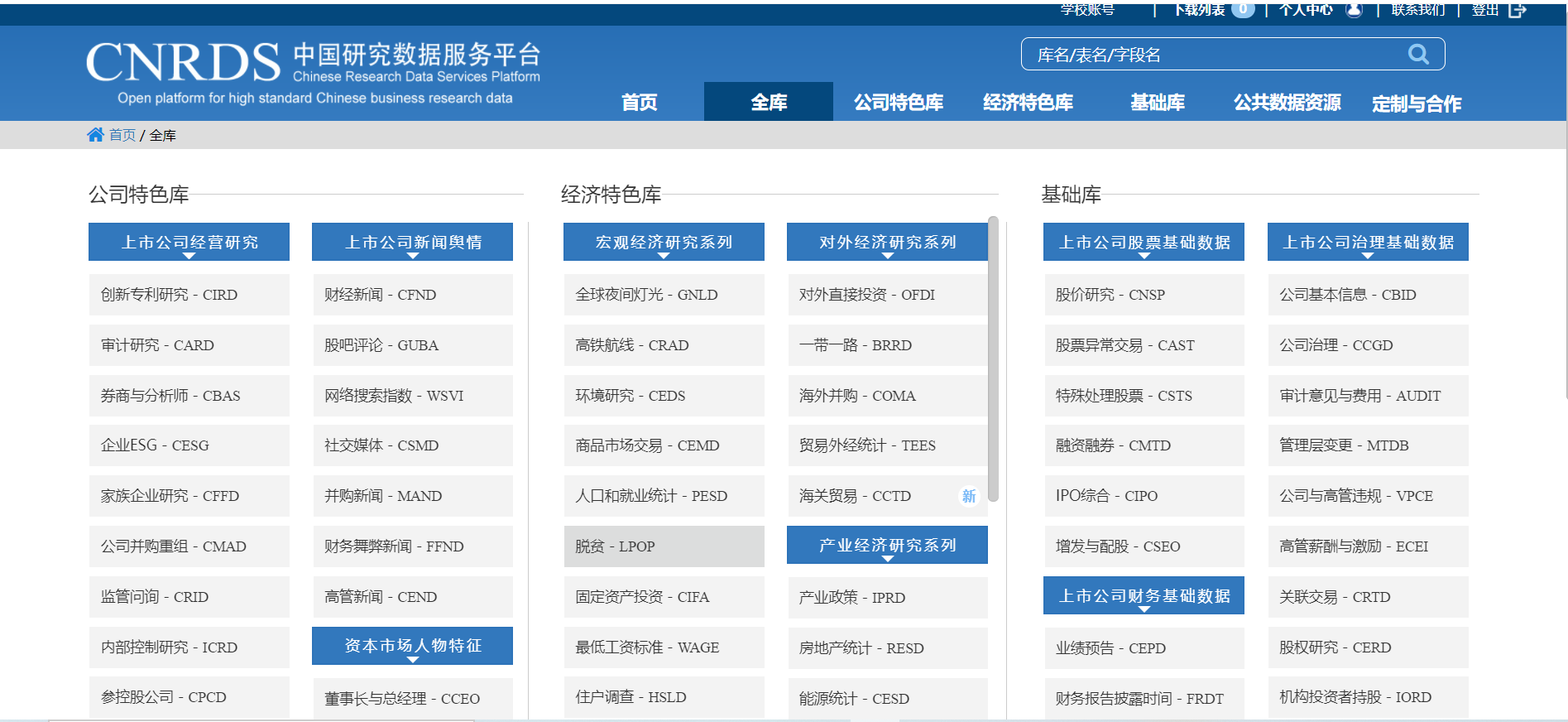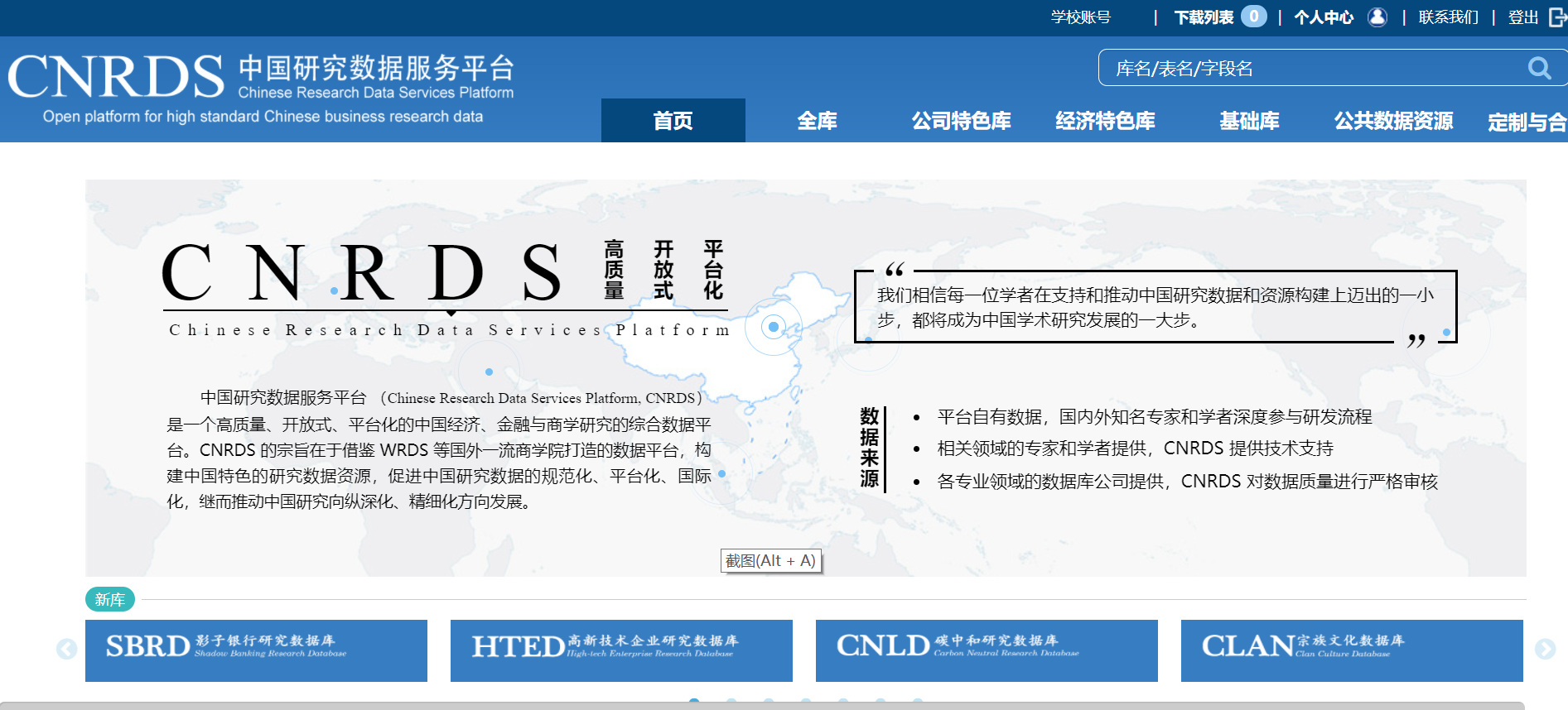 中国研究数据服务平台 (Chinese Research Data Services Platform, CNRDS)是一个高质量、开放式、平台化的中国经济、金融与商学研究的综合数据平台。CNRDS 的宗旨在于借鉴 WRDS 等国外一流商公司打造的数据平台,构建中国特色的研究数据资源,促进中国研究数据的规范化、平台化、国际化,继而推动中国研究向纵深化、精细化方向发展。