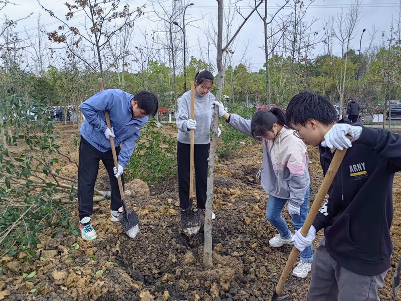 活动现场,经开区芙蓉社区工作人员为大家传授植树知识与技巧,讲解树苗品种、养护方法。随后,同学们投入植树劳动中,分工明确,默契十足,挖坑、扶树、填土、浇水,在大家的共同努力下,苗圃内树苗林立,一片生机盎然。植树劳动结束后,同学们纷纷表示在劳动中不仅锻炼了身体、亲近了自然,更体会到劳动实践的深刻意义。