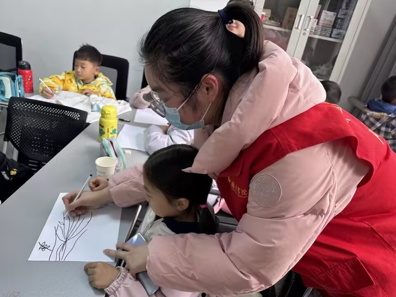 活动伊始,志愿者同学带领国祯书院学而班小朋友们诵读了《大学》中的篇章,纠正了读音和识字错误。随后,志愿者同学播放中华传统礼仪故事小视频,引导小朋友领略中国“礼仪之邦”的深刻内涵,以古人事迹为小朋友树立行为榜样。志愿者同学还带领小朋友们一起完成“惊蛰”节气主题的手工活动,普及了“惊蛰”这一节气的相关知识,向小朋友们介绍惊蛰节气与农耕的关系。现场欢声笑语、氛围融洽,小朋友们在动手绘画中潜移默化掌握了惊蛰节气知识。