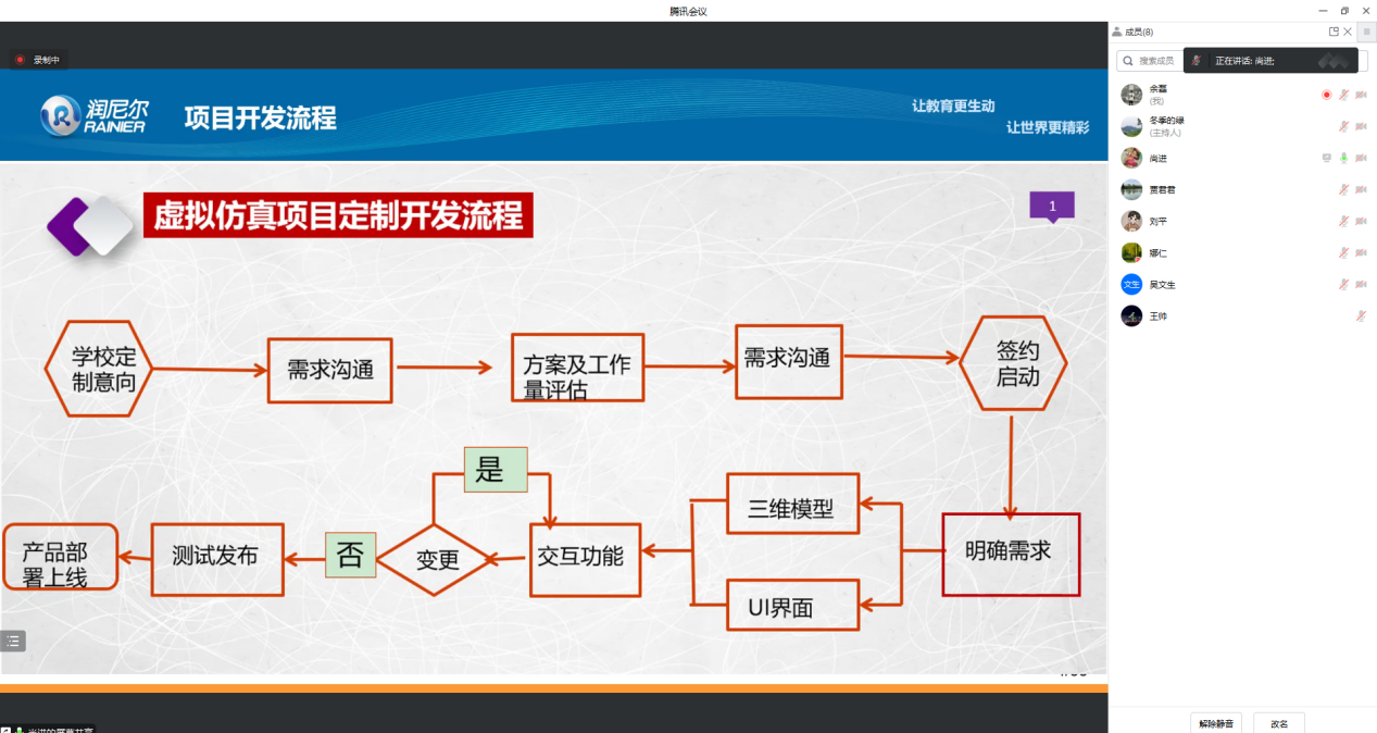 会上,润尼尔网络科技有限公司人员刘平对项目的整体开发流程作了系统性阐述,对每一时间节点的具体任务内容作了简要梳理,并对此次项目建设开发团队、对接人员作了基本介绍。随后,贾君君副教授作为公司项目开发团队负责人,对项目脚本及主要内容设想作了详细汇报。最后,双方就高标准虚拟仿真教学项目的特点、要求等进行了信息交流,并对项目的框架、文本大数据资源、虚拟仿真的实验效果以及在建设过程中可能出现的问题展开了沟通。
