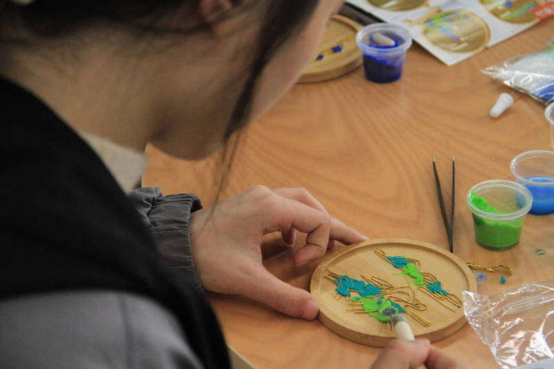 活动伊始,活动负责人向同学们分发了此次活动的材料——掐丝珐琅,并细致讲解了掐丝珐琅杯垫的制作步骤和注意事项。活动中,同学们跟随志愿者同学,耐心学习掐丝珐琅制作的的指尖动作,轻扯、慢扭,片刻间手中的金丝已经被摆造成一幅幅山水图。“这个杯垫我会放在寝室作为一个日用品也作为一个装饰,通过亲手制作掐丝珐琅杯垫,我真切感受到非遗技艺的魅力,也意识到日常的生活劳动也可以这么美妙。”2021级员工白雨欣说道。