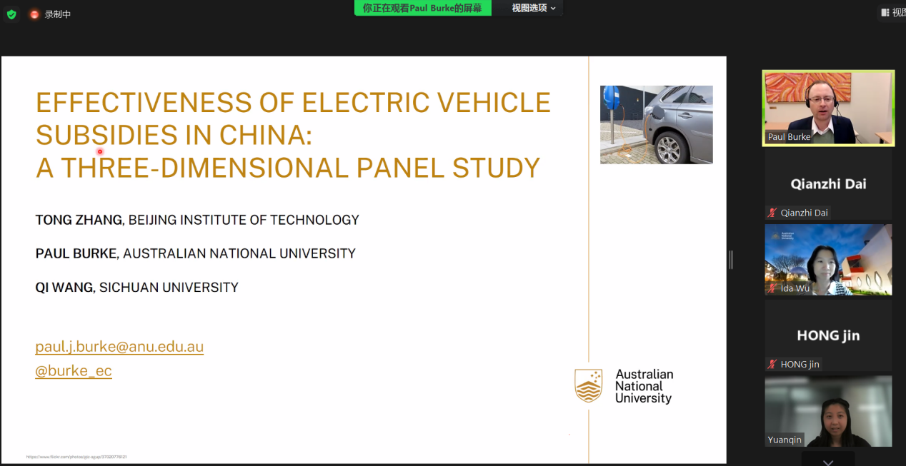 会上,Paul Burke教授讲解了自己以及团队关于“中国电动汽车补贴的有效性”方面的研究,即采用三维数据集,估算中国316个城市国内电动汽车购买补贴对采用的影响。得出中国的购买补贴对鼓励国内电动汽车升级做出了重大贡献,但阻碍了进口电动汽车使用等结论。讲座内容充实、鞭辟入里,引发在场师生的积极思考,并进行了深入交流与讨论。