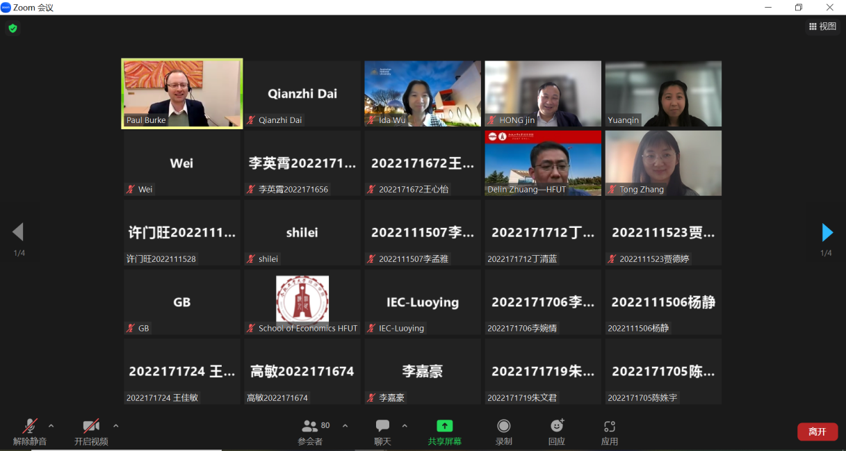 Paul Burke教授致力于能源经济、环境经济、交通经济相关问题的研究,近年来主要关注亚太地区零碳能源政策、碳税及碳市场等研究方向。本次讲座展示了世界经济前沿研究焦点,使与会师生在研究方向、研究思路、研究方法等方面倍受启发,受益良多。