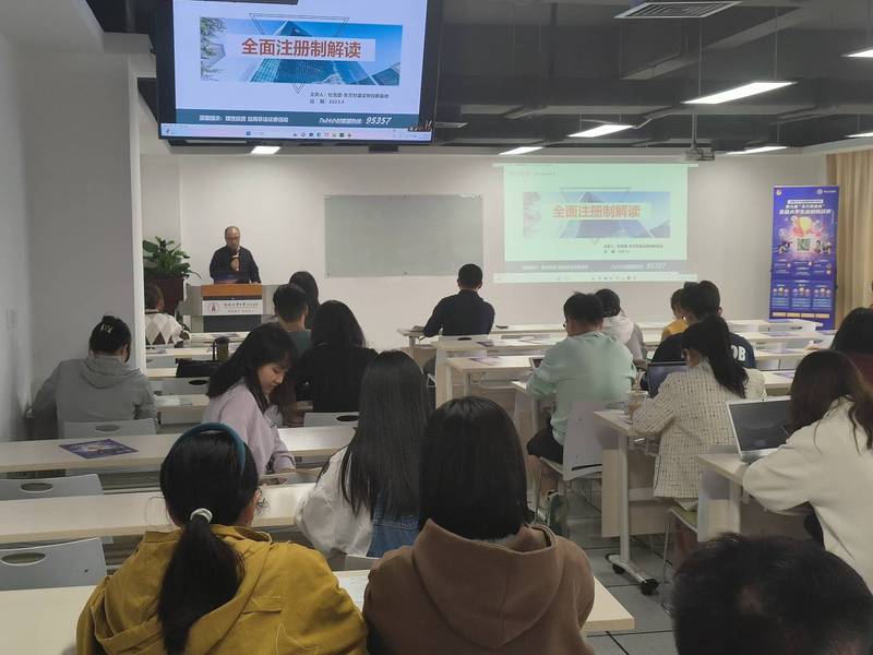杜名望首先为同学们带来题为“全面注册制改革解读与量化投资策略设计”的讲座,分别从“注册制相关概念及改革历程”、“注册制与核准制”、“注册制改革亮点及意义”三个角度解读了“注册制”及其改革亮点,引导员工充分认识到股票发行注册制改革对改善国内资本市场环境的重要意义。随后,杜名望介绍了“东方财富杯”证券投资比赛的基本情况与比赛流程,号召同学们以赛促学,在比赛中掌握金融知识、培养投资实践能力。
