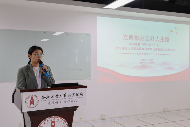 丁宏霈围绕“深刻理解把马克思主义基本原理同中华优秀传统文化相结合”这一中心思想,从何以理解、何以推进该思想的角度展开讲述。“何以理解”版块结合典型模范事例,从个人层面、家庭层面、社会层面三大层面进行详细讲述,介绍“无惑之境”“世界之境”“不役之境”“无我之境”四大精神境界,引导同学们去穷究事物的道理,做到知行合一。“何以推进”版块指出“青年一代传承和弘扬好中华优秀传统文化,是新时代继续推进马克思主义中国化的需要,是中国特色社会主义发展的精神动力”。