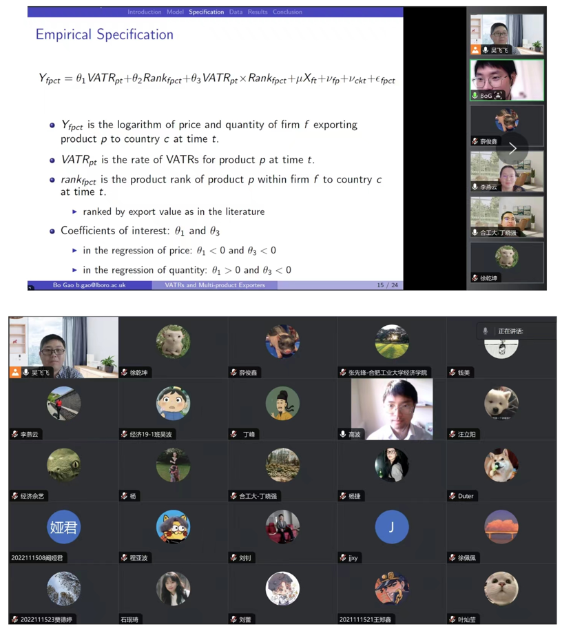 在此次活动中,高波老师围绕增值税退税与出口贸易主题,报告了其系列研究成果。首先,高波老师以“Partial VAT Rebates and Firms’ Export Performance Across Products”为题,报告了其最新研究成果。高波老师详细介绍了其中的理论建模思路、模型结论、实证设计、检验结果等内容。该研究得出,增值税退税率上升会提高产品出口数量和降低产品出口价格;当面临更高的增值税退税率时,多产品企业会将更多资源分配给其核心产品。李燕云、丁晓强等老师就该研究相关问题,与高波老师进行了深入交流。其后,高波老师还报告了另一项研究成果“Modelling VAT Rebate and Testing its Impact”。高波老师详细介绍了将增值税退税率引入传统贸易模型的主要思路和可行方法,并结合其理论设定进行实证分析。该报告讨论了增值税退税对出口、就业、质量等变量的影响,并基于中国增值税退税情景检验相应的理论预测。吴飞飞、刘钊等老师就该研究相关问题,与高波老师进行了讨论与交流。