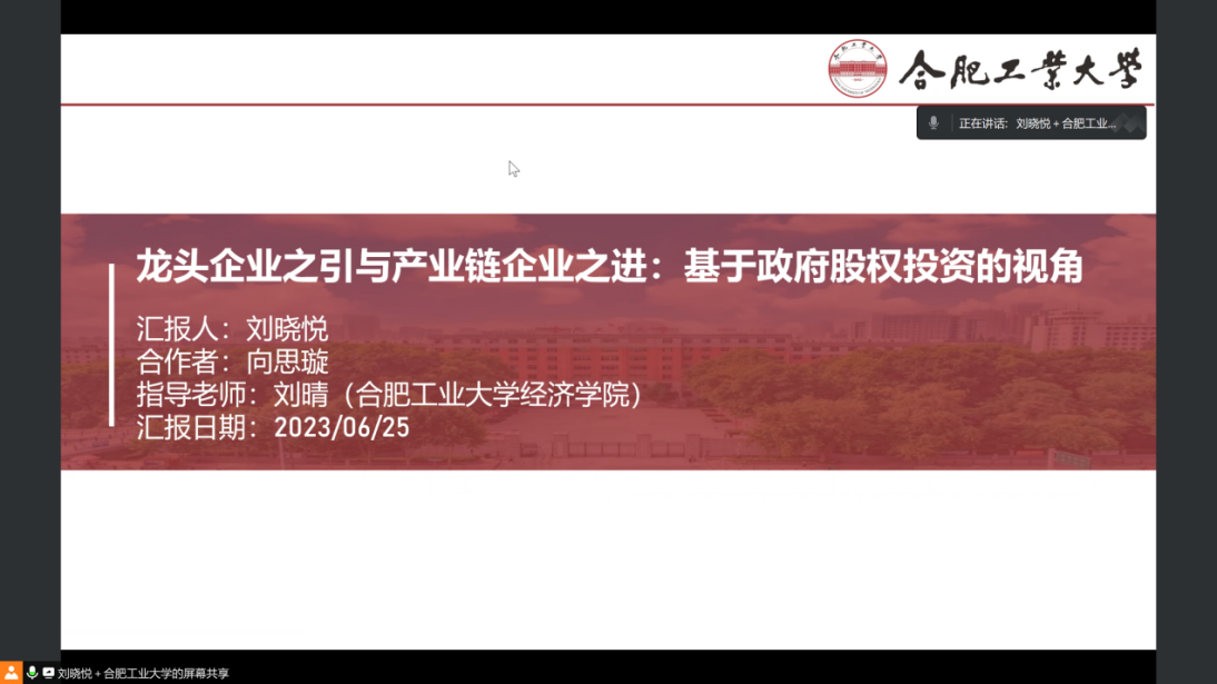 汇报中,刘晓悦同学从研究背景与意义、理论机制与主要假设、实证研究结果、异质性分析、结论与启示及后续讨论六个方面作汇报。文章基于城投平台转型的现实背景,着眼于合肥市政府股权投资的典型案例,用多种稳健性检验方法对模型进行严格的实证检验,得到城投公司能够通过引进龙头企业、积极股权投资以增强产业链上下游创业活力的估计结果。汇报结束后,安徽大学许文立老师对论文作出点评,对研究问题的现实意义和研究结果给予肯定,并给出技术层面改进、变量测度完善的建议。