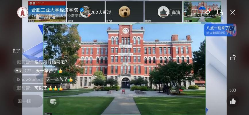跟随着直播镜头,主播们带领观众依次游览了克拉克大学的教学楼、图书馆、宿舍楼、食堂等地点,介绍了克拉克大学优美的校园环境、独特的校园建筑和完善的生活基础设施。另外,主播们以自己的亲身经历,分享了在克拉克大学的优质的课程体验和生活感受。观众们积极参与互动,反响热烈。