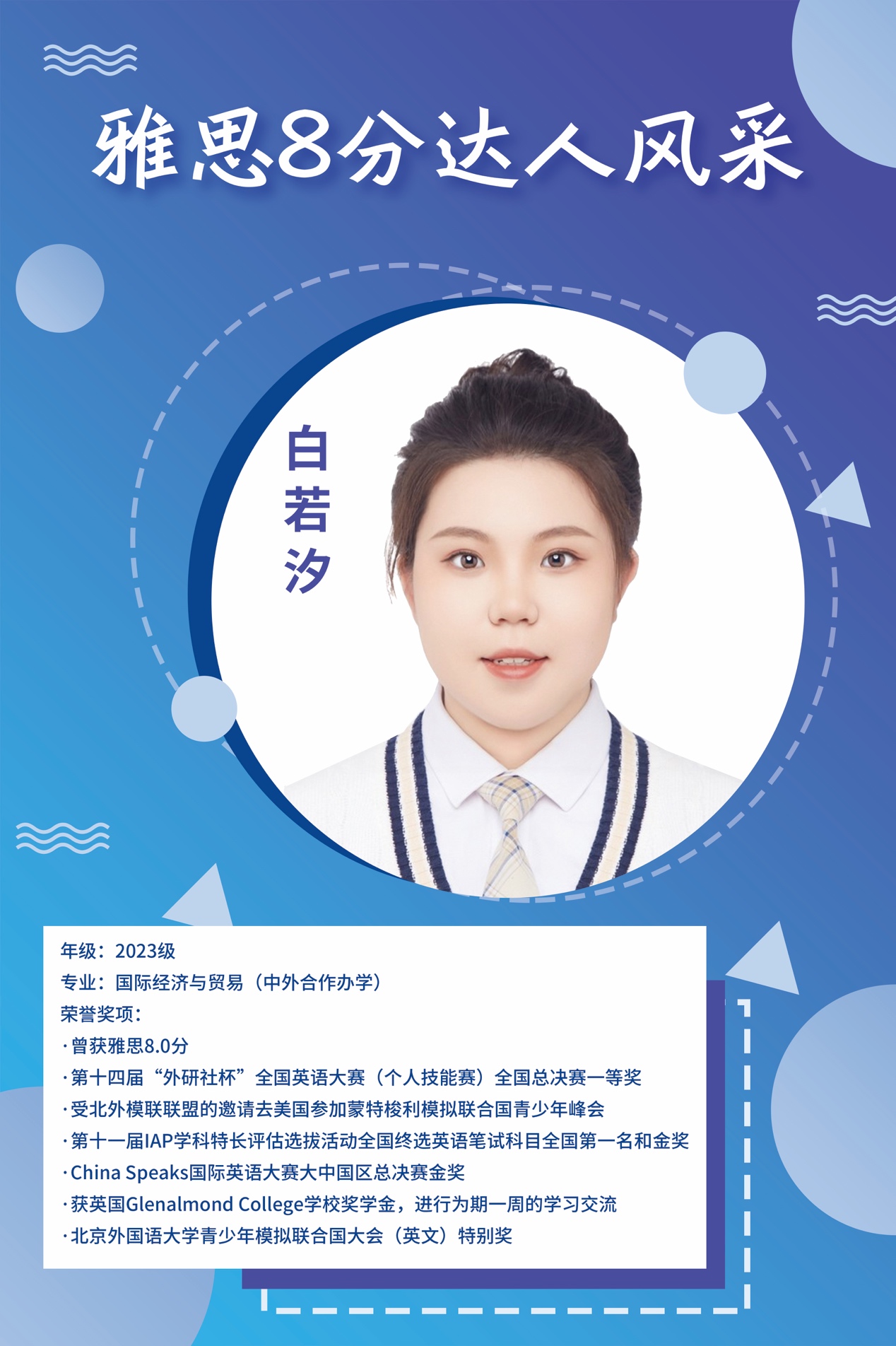 每一次英文比赛和活动对我都有很多启发,带给我很多收获。首先是对语言能力的提升,在一次次发言中,我的听和说方面的能力不断进阶。其次是对信心的鼓舞,从胆怯到勇敢,从磕磕巴巴到对答如流,每一次英文讲话帮助我收获信心。然后是对视野的开拓,通过与不同选手和考官的交流收获新的想法,感受不同观点的碰撞,开阔视野,让自己的视角更加全面立体。最后是对性格的锻炼,反复的准备过程和紧张的比赛过程锻炼了我的心态,让我的韧性和抗压能力更强。