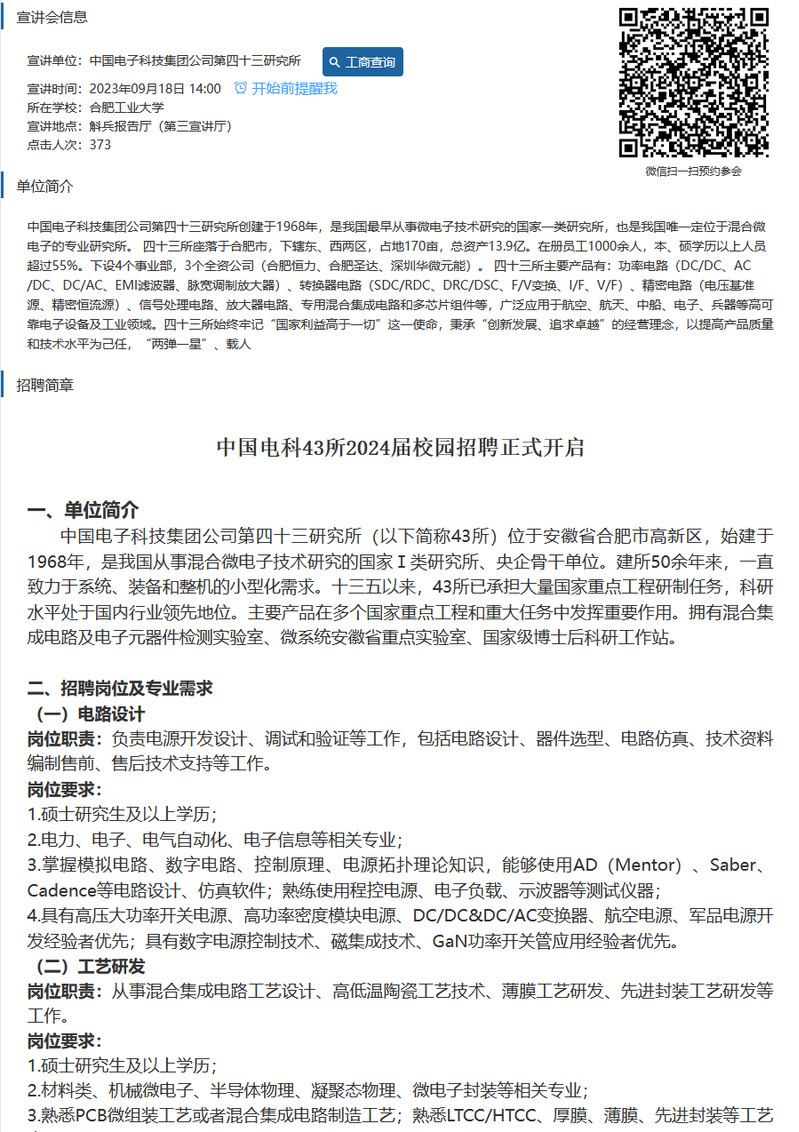 【招聘信息】中国电科43所2024届校园招聘正式开启