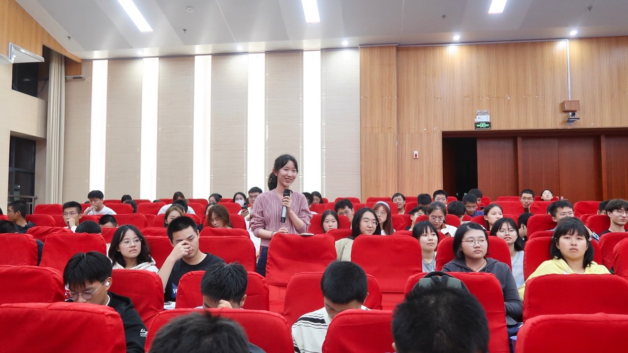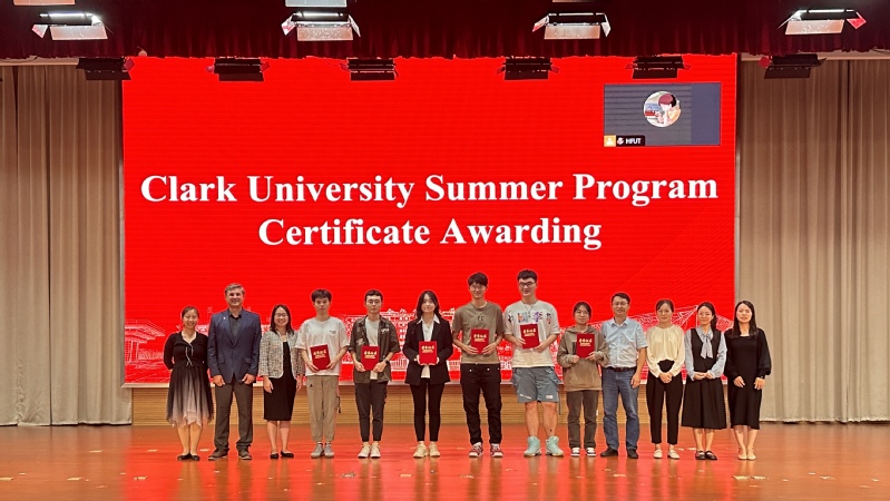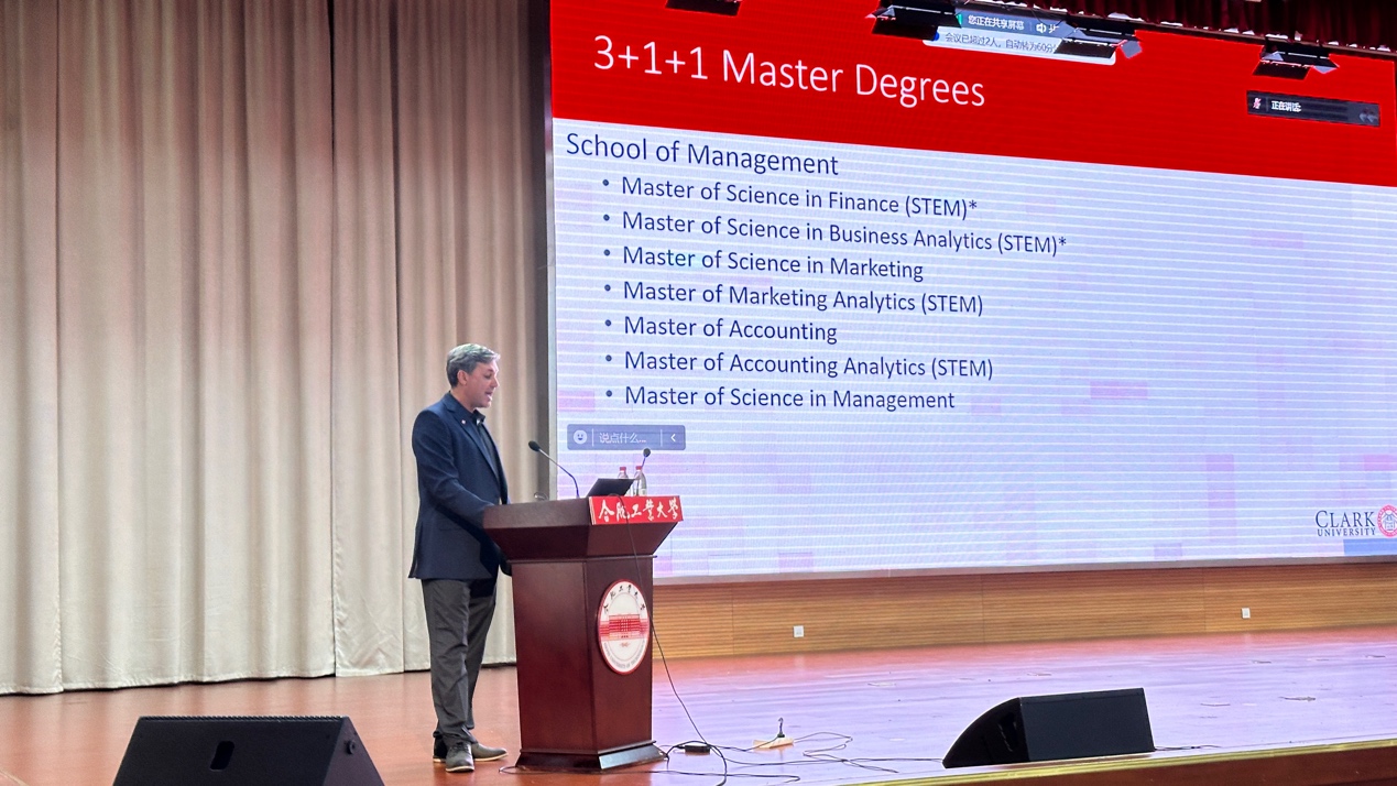 当天晚上,克拉克大学代表与公司全体本科生见面会在科教楼A座大报告厅顺利举行,宣城校区本科生线上同步进行。Chen Yingying和Ercan Balci分别介绍了克拉克大学以及“3+1+1”联合培养项目,员工就赴克拉克大学留学、英语语言挑战等问题进行了提问,并得到了Ercan Balci和Chen Yingying的耐心解答。现场气氛热烈,效果良好。随后,公司22级国际经济与贸易(中外合作办学)专业朱灵娜和23级国际经济与贸易(中外合作办学)专业白若汐作为员工代表分别上台英文发言。最后,克拉克大学代表、公司国际教育中心老师以及23级辅导员王梦茹为顺利通过2023年暑期克拉克大学暑校项目的六位员工颁发证书。