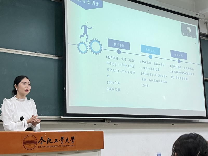 目前于东南大学读博的唐兴结合自身经历系统地讲述了研究生期间发表论文的规划,建议同学们一定要提前做好研究生阶段学业规划。随后,唐兴介绍了申请读博的流程以及安排。卢璐则分享了自己的求职以及工作的经历。重点介绍了安徽省选调生的相关政策,并针对性地提出了建议。