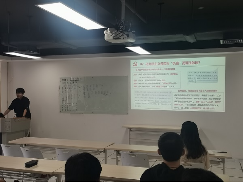 对于首期“经马者说”读书分享会,第一党小组选取了《伟大也要有人懂——一起来读马克思》一书进行专题分享。小组结合书本前三章节的内容提出三个问题——“什么促使了马克思对于资本的思考”、“马克思主义是因为‘仇富’而诞生的吗”以及“公民与市民的区别是什么”,并引用书中以及《青年在选择职业时的考虑》和《资本论》中的原文对这三个问题进行了生动阐释。最后,小组通过对国产动漫《领风者》中相关片段的回顾,使党员同学对马克思的生平经历有了系统了解。