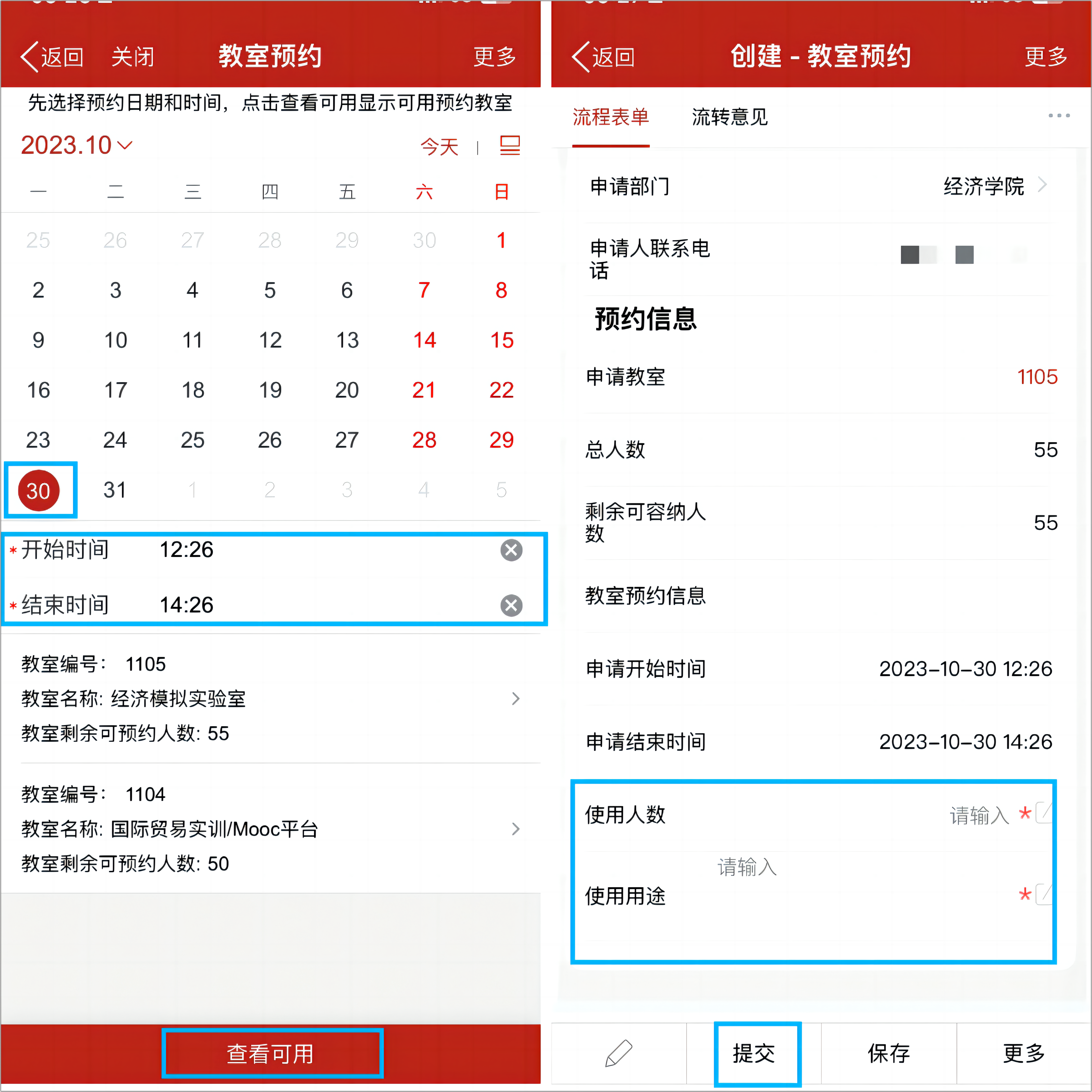 2. 教室由于空间较大,正常在同一时段会允许多名同学预约借用。如若需要借用整间教室,在填写“使用人数”时需要填写最大容量,并填写借用事由;