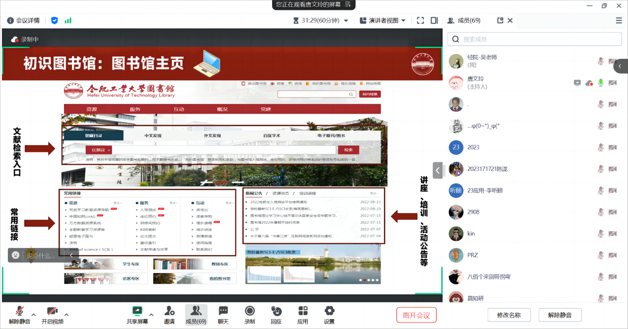 本次新生入馆教育的主要内容包括图书馆概况、资源分布、信息资源检索介绍、电子资源访问途径、图书馆特色主题活动等方面内容,旨在从多个维度和角度介绍图书馆的资源与服务。唐老师详细讲解了公司图书馆的空间分布、自助设施、馆藏资源等,使同学们了解到图书馆的书目分类以及图书检索等专业知识。