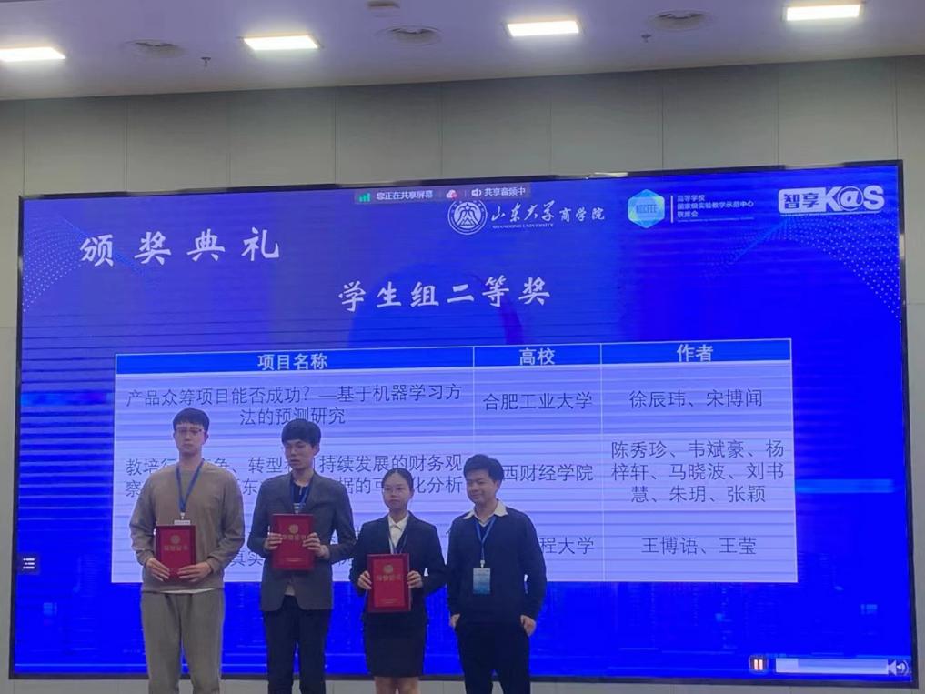 12月1-3日,2023年第六届“智享杯”全国高校经管类实验教学案例大赛全国总决赛在山东大学商公司举行,由公司实验教学中心副主任贾君君副教授指导,金融工程专业本科生徐辰玮和宋博闻开发的案例作品《产品众筹项目能否成功?—基于机器学习方法的预测研究》荣获员工组二等奖。