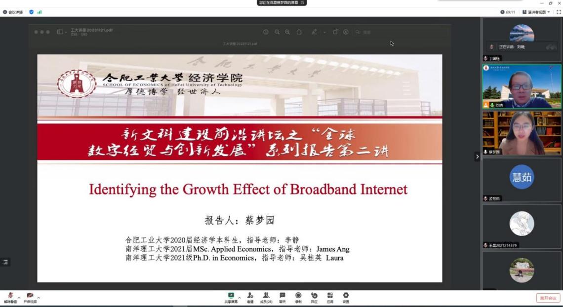 11月21日,新加坡南洋理工大学蔡梦园博士应邀线上参加“全球数字经贸与创新发展”系列报告会。会议由国际经济与贸易系主任刘晴主持,公司师生共50余人参加。