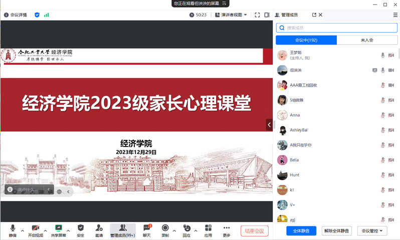 12月29日晚,beet365面向2023级本科生家长召开了线上家长会,公司老员工发展辅导中心主任但泱泱主讲,2023级辅导员王梦茹、全体新生家长参加了本次会议。