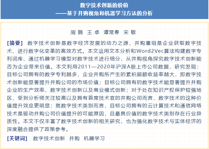 近日,公司周鹏老师、谭常春老师与上海财经大学金融学博士研究生王卓、武汉大学经管公司宋敏教授合作论文“数字技术创新的价值——基于并购视角和机器学习方法的分析”在《中国工业经济》2024第2期发表正式发表。王卓系beet365培养、谭常春和周鹏老师共同指导的优秀硕士研究生。本论文得到:国家社会科学基金重大项目“新形势下全球创新网络演化及风险治理研究”(批准号 20&ZD072);国家自然科学基金青年项目“监管科技与上市公司信息披露质量:赋能监管、公司响应与经济效果”(批准号 72302073);中央高校基本科研业务费专项资金(# JS2022ZSPY0025)资助。《中国工业经济》由中国社会科公司工业经济研究所主办,是应用经济学和管理学类综合性权威理论刊物,重点覆盖国民经济、产业经济、工商管理、案例研究等学科领域,2023年的复合影响因子为24.929。