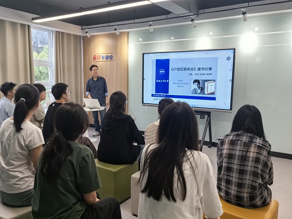 读书会上,周华东老师介绍了书籍《21世纪资本论》的创作背景和主要内容,总结了作者的核心观点和经典语录,从“收入和资本”、“资本/收入比的动态变化”、“不平等的结构”、“21世纪的资本监管”四个方面做出详细解读。各读书小组代表依次上台,分享了读书感悟,展示了本组成员撰写的读书笔记和思维导图,结合在阅读书籍中产生的疑问,与周华东老师进行了深入探讨。