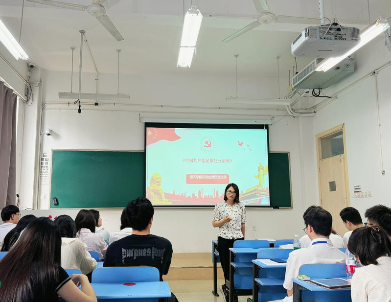 会上,研究生党员陈梓萌围绕《中国共产党纪律处分条例》修订的背景、要点及主要内容,带领在场党员逐字通读条例原文,并作交流发言,使支部党员对党规党纪有了更深刻系统的认识。随后,凡菊就本次党课学习作出指导。凡菊强调,党纪学习是党员的基本责任,党纪是中共党员最基本的底线,每名党员要把党纪落实到学习、生活和工作中去,时刻保持对党纪的敬畏之心。