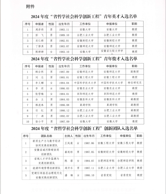 “省社会科学创新工程”优秀青年人才及创新团队培育计划是落实省委、省政府《关于加快建设文化强省的指导意见》和省委关于实施人才兴皖工程的重大决策部署,为进一步繁荣我省哲学社会科学事业提供有力人才支撑的重大举措。全省共入选青年英才5名,青年俊才10名,创新团队5个。