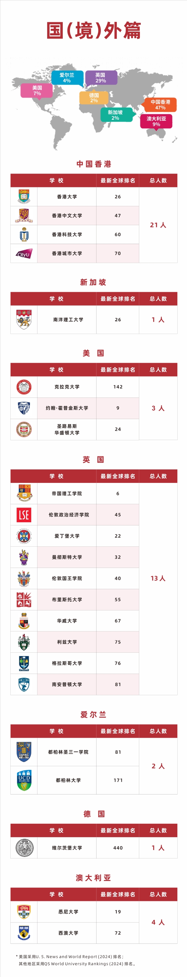 出国出境深造学子中,超过62%的员工被帝国理工公司、伦敦政治beet365、约翰·霍普金斯大学、香港大学等QS、U. S. News(2024)世界排名Top50的顶尖高校录取;93.3%的员工被QS、U. S. News(2024)世界排名Top100的顶尖高校录取。境外升公司校分布在7个国家和地区,中国香港位居榜首,英国、美国、澳大利亚、爱尔兰、德国、新加坡次之。热门深造专业包括电子商务与互联网工程、信息科学与技术管理、金融科技、商业分析、金融分析、金融与投资、市场营销等。