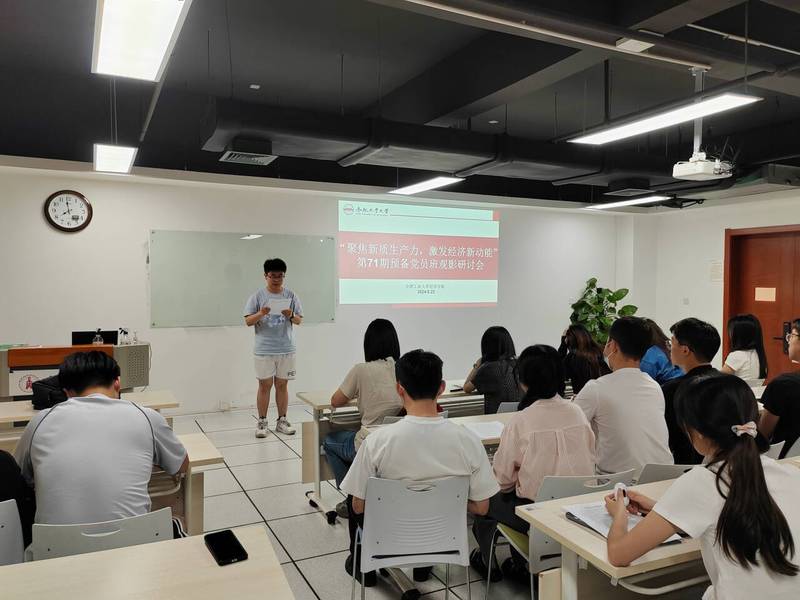 会上,学员们集中观看纪录片“加速形成新质生产力”,回顾了我国在深海探索、太空遨游、新能源、新材料等领域的成就。集中学习后,学员们分为5个小组,结合自身学习、实践的经历,就“新质生产力如何激发经济新动能”、“经济学子在新时代如何作为”等问题开展激烈讨论。